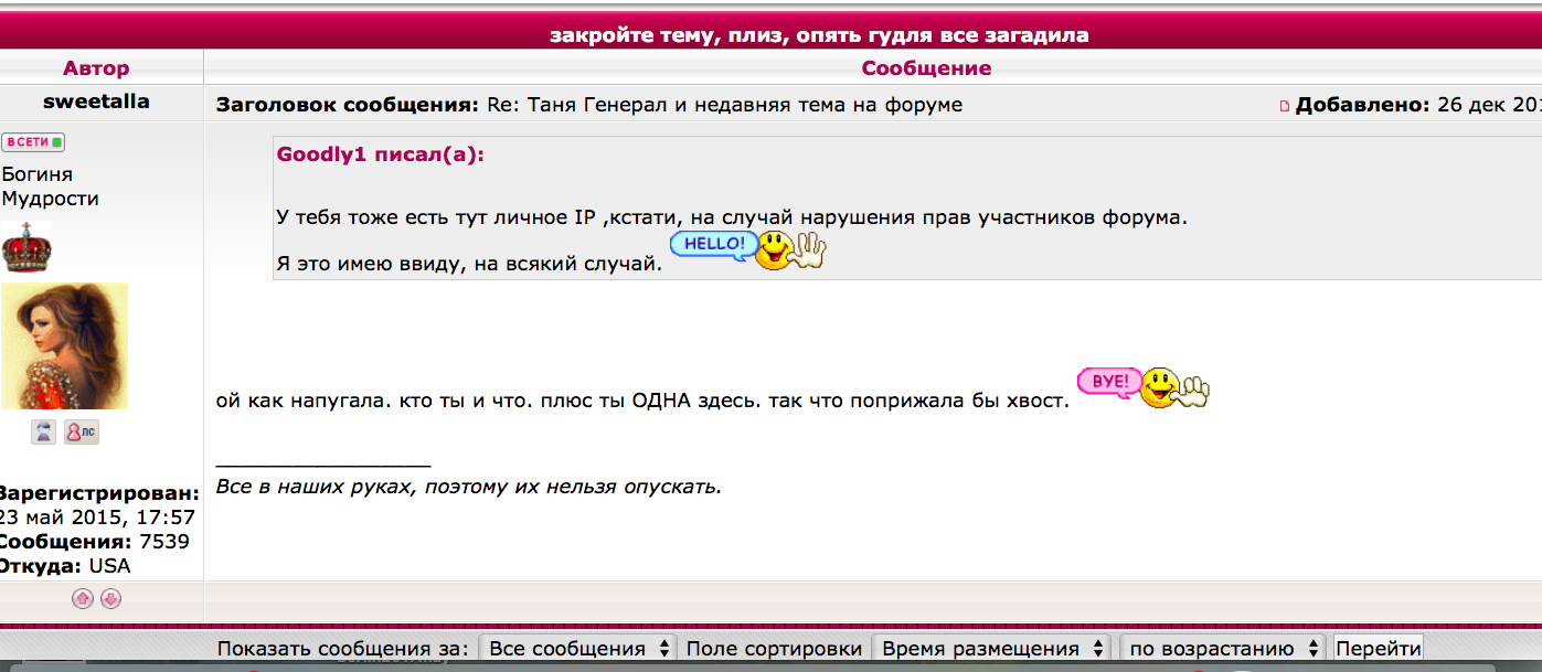 Goodly1 писал(а): Поняла все, да? О.К. и, надеюсь, подружка твоя тоже поняла.  мне настолько наплевать на все, что ты там пишешь. можешь не стараться сочинять свои простыни.