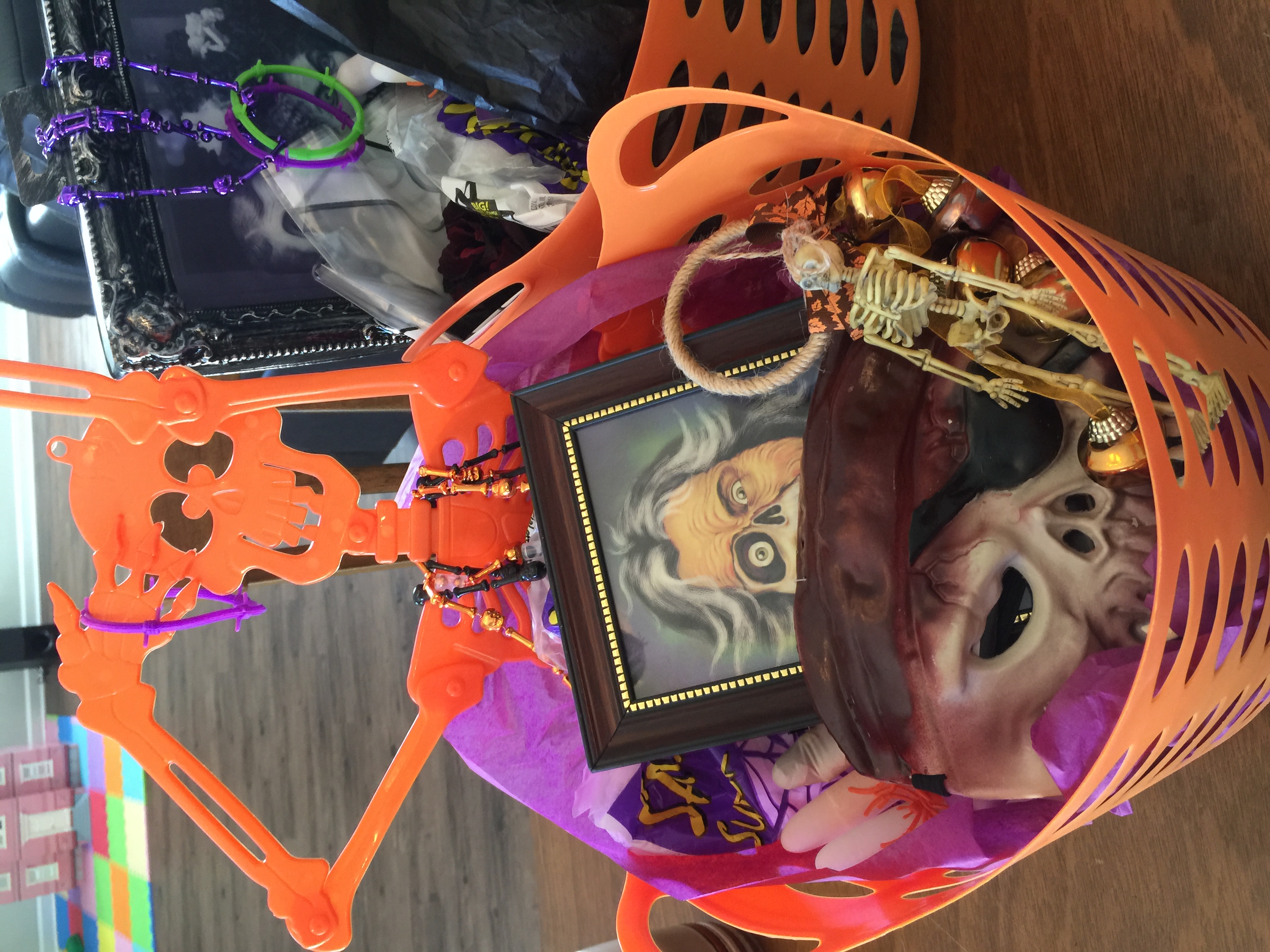 Вот мои корзинки, засунула туда любимые меняющиеся портреты, маски, черепа, скелеты, пауков. Набила перчатки конфетами, завязала, надела на перчатки светящиеся кольца. Так весело!
