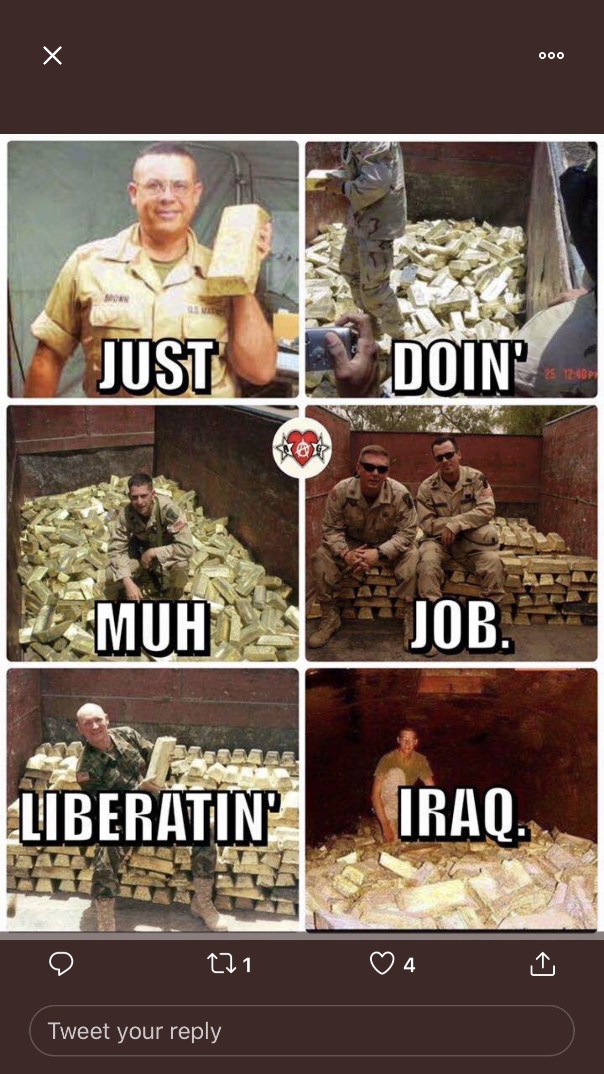 Это как 9/11 придумали атаку — Ирак создаёт ядерное оружие— идём воевать в Ирак— оружия нет— захватили нефть— разграбили Ирак; под шумок часть прав и свобод граждан убрали— везде Х-рэйс; обыски в аэропортах; слежка, проверки.