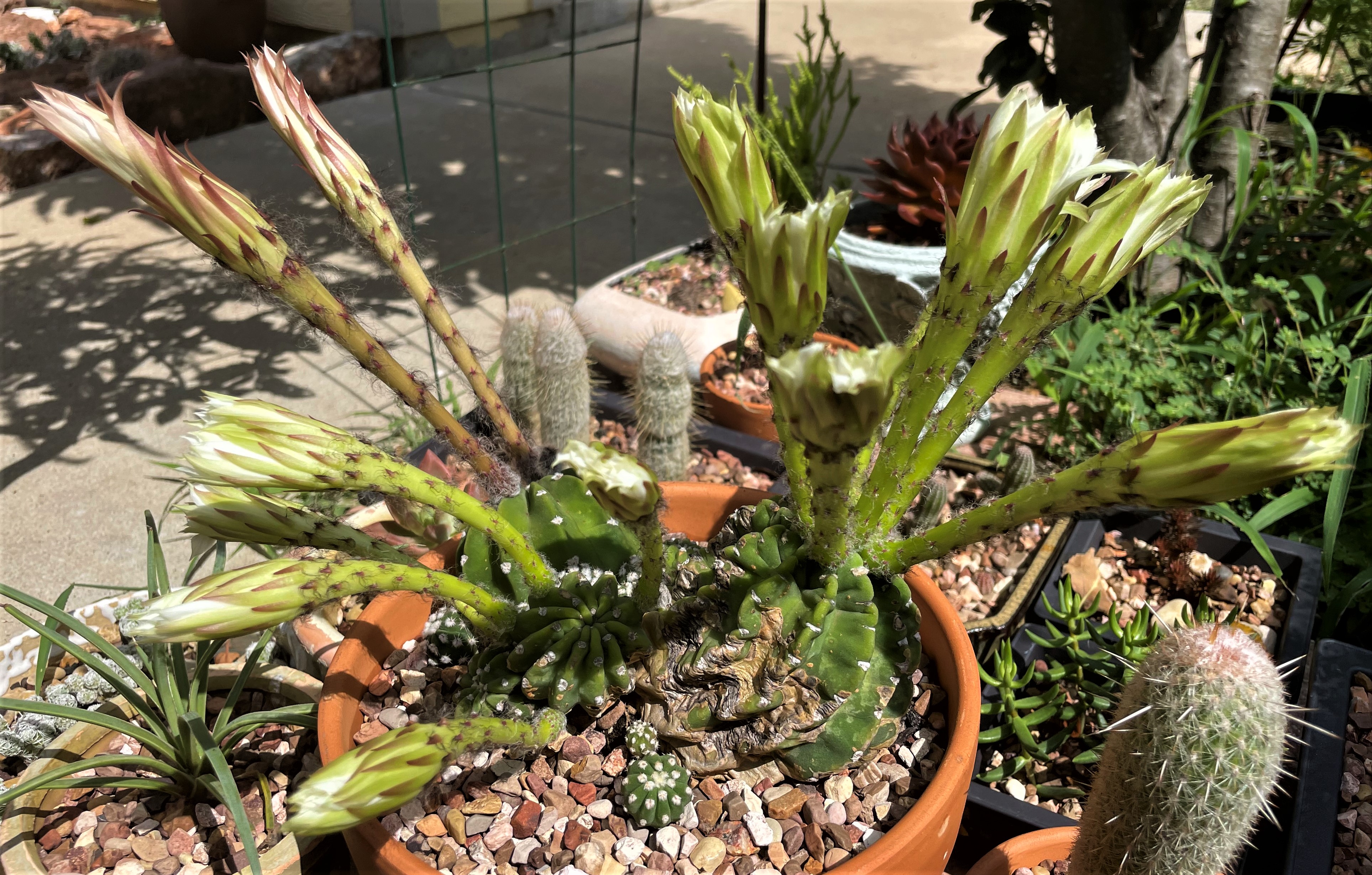 дык...вот так...(рыдаю, уткнувшись в плечо) название я совсем точное не знаю - какой-то эхинопсис, полагаю навскидку. Вот он так цвел несколько недель назад - это было 4 цветка ( а тут бы - 14 (рыдаю с новыми силами)) По поводу тени для других сукк - сосиски (и некоторое другое тоже) висят у меня с северной стороны дома. Солнце есть - утром и прям вечером. Нормально им, вроде...надо попробовать на полное солнце (почитать сначала), вдруг будут краше. Они не глубоко под крышей, прям с краю, но от дождя им попадает совсем мало. У нас тоже дождливый год. Другие подвесные висят далеко от дома, тоись каждый дождь аккурат в них сыплется. Но они все в корзинках, вода там совсем не задерживается. земля - для суккулентов, тоись легкая и влагу не держит особо. Опять же я смотрю в нюрсерях - там все поливают под одну гребенку, и суккуленты, кажется, тоже постоянно политые - растут, не жалуются. Корзинки подвесные если великоваты - возьмите из доллар три корзиночки поменьше ( мои сосиски в них сейчас на фото страницами раньше). Еще вчера вот такую корзинку в Доллар дженерал увидела - это прям вообще шикардосная, наверное мне ее тоже надо  она будет как птичья клетка для суккулентов (да хоть для чего, вложить лайнер снизу и в путь, ручки я бы сняла, и на цепочки подвесить)