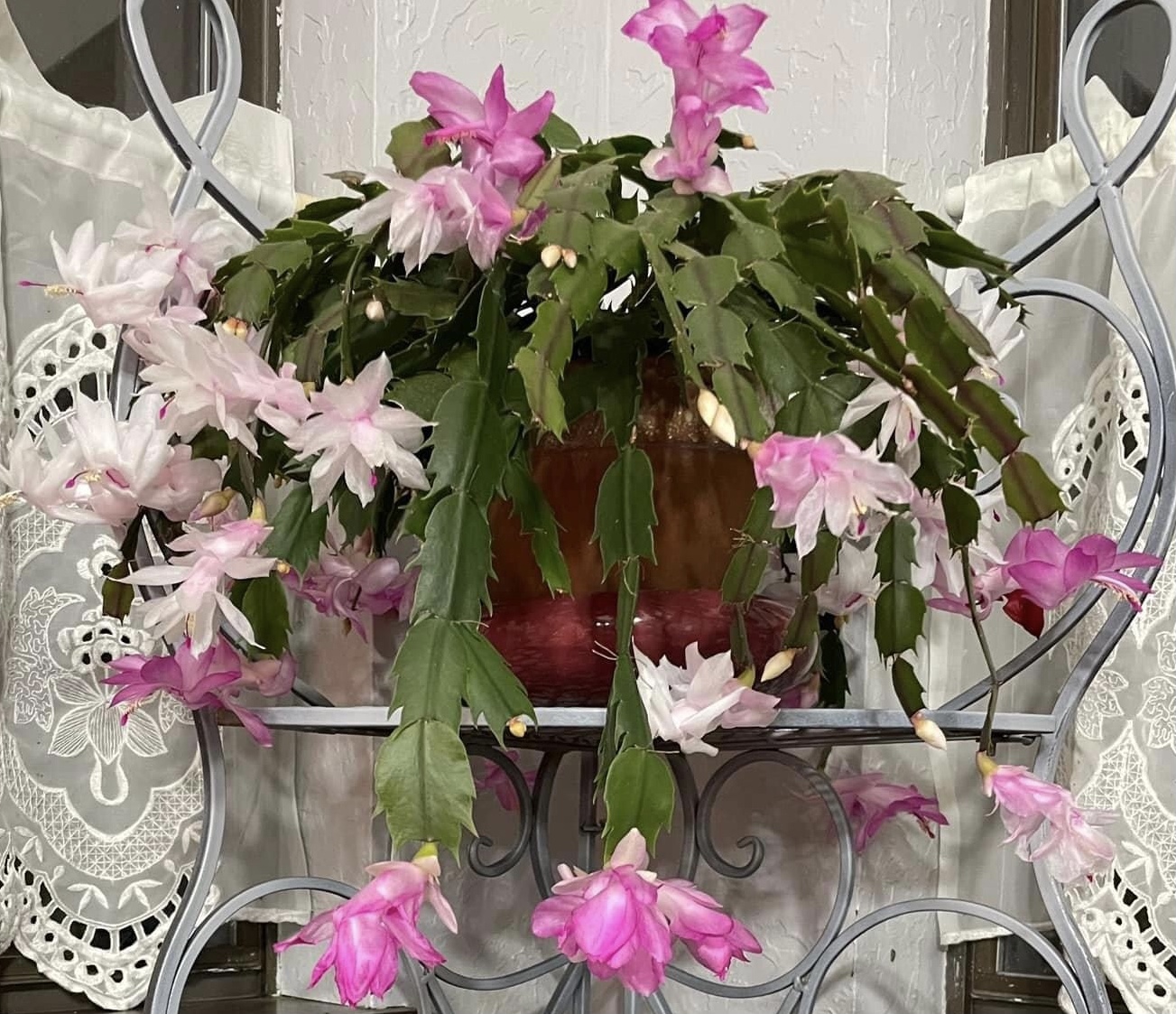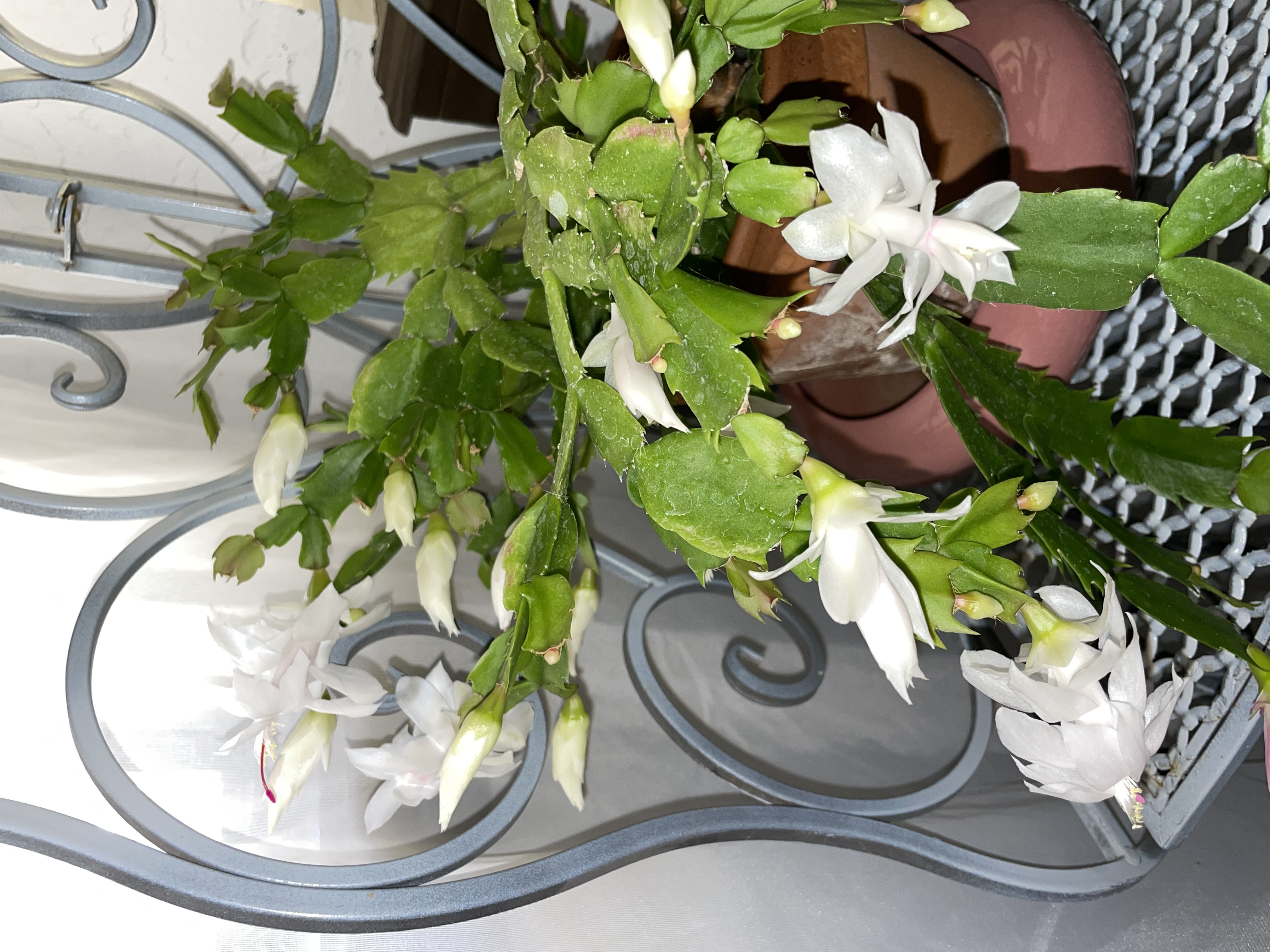 Хом, спасибо! Метелки- это shrimp plant. Летом он- терракотовый, а по осени проявляется вишневый оттенок. Зигокаки хороши в любом цвете! Этот тот горшок, в котором ботва была красного цвета?  Мой бело-розовый тоже в белый трансформируется?