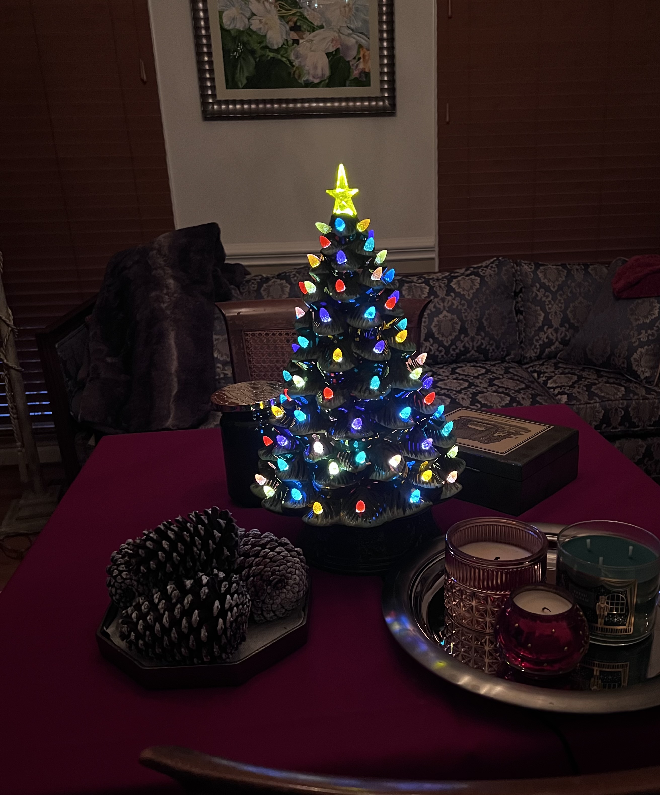 Привет, Мия, елка у нас маленькая керамическая из Кастко с фонариками, а вот перила сегодня украсили.