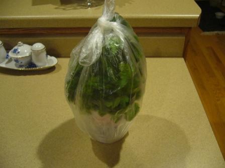 Извините, что вчера не запостила. Вот, даже и не помню, когда покупала, недели 2 назад точно, может и 3. И еще столько же простоит. Почему заворачиваю в пакете, потому что там влага образуеться и листочки не сохнут. Мне зелень нравиться крепкая и свежая, я вялую выкидывала всегда. Даже в магазах она может показаться вялой, но поставьте в воду, и будет вот такой букетик.