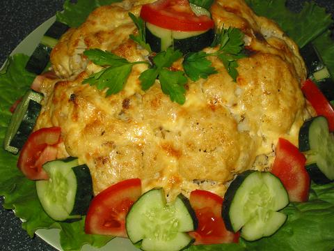 Тигрица, с цветной капустой всё совсем просто: кочанчик от листиков очищаете, кочерыжку подрезаете, если нужно, замачиваете на полчаса в солёной воде, опускаете целиком в кипящую воду головой вниз (нужна кастрюля побольше), отвариваете несколько минут - зависит от величины кочана, так, чтобы нож в кочерыжку легко входил, но не переварите, а то развалится на соцветия. Сливаете. Противень застилаете фольгой, на неё выкладываете капустную голову шапкой вверх, кочерыжкой вниз. В чашке смешиваете в густую смесь тёртый сыр (лучше нескольких сортов), давленый чеснок, очень мелко рубленый базилик, соль, паприку и майонез (можно всё это в блендере) и намазываете этой смесью капусту толстым слоем. Духовку разогреваете до 400 Ф и запекаете до золотисто-коричневой корочки, можно под грилем тоже. Как достанете, дайте ей чуть-чуть отдохнуть, минут 5-7, потом осторожно, двумя широкими лопатками переложите на круглое плоское блюдо, выложенное листьями кудрявого салата. Разрезаете уже на столе. Фото не моё.