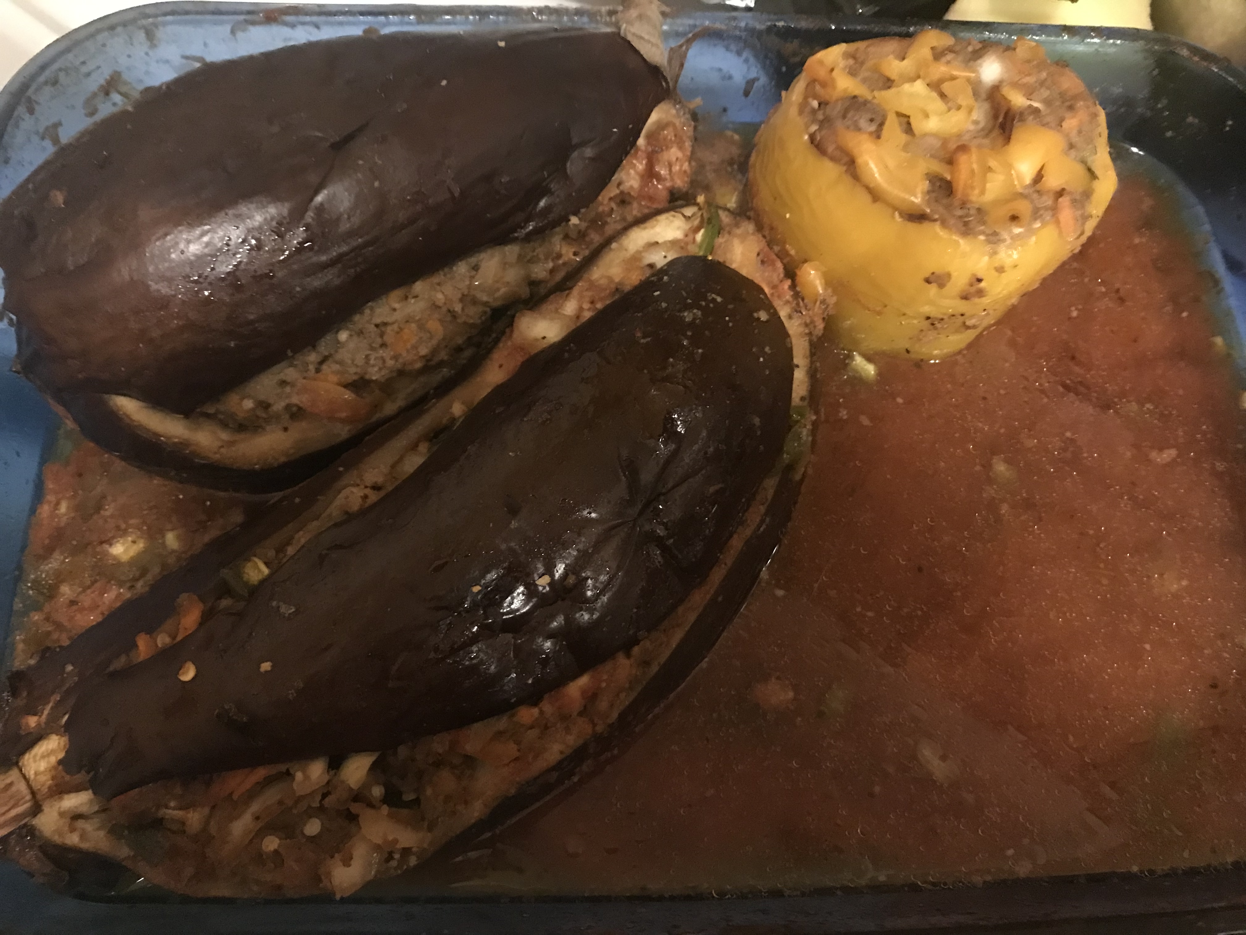 А у меня сегодня были фаршированные баклажаны. Фаршировка обычная : фарш, лук , морковь, цукини, специи. Но вот что делает это блюдо изумительным, это nutritional yeast.