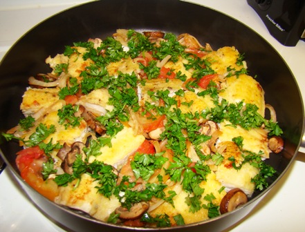 - 3 небольших филе сома (без кожи) - мука для жарки - лук репчатый, 1\2 небольшой луковицы - помидор - грибы свежие, горсть (для ускорения процесса я покупаю резаные) - зелень петрушки или укропа по вкусу - 2 крупных яйца - 1\3 чашки молока - тёртый сыр, 1 ст. ложка с горкой - масло для жарки (я использую спрей) -соль, свежемолотый перец