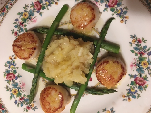 Соус простейший: ст.л. кунжутного масла, чуть меньше ч.л. жидкого меда (хорошо сочетается со сладостью гребешков), сок и цедра половики лимона (лимон хорош к рыбе и другим морским гадам). все. этот же соус и к crab cakes у нас идет.