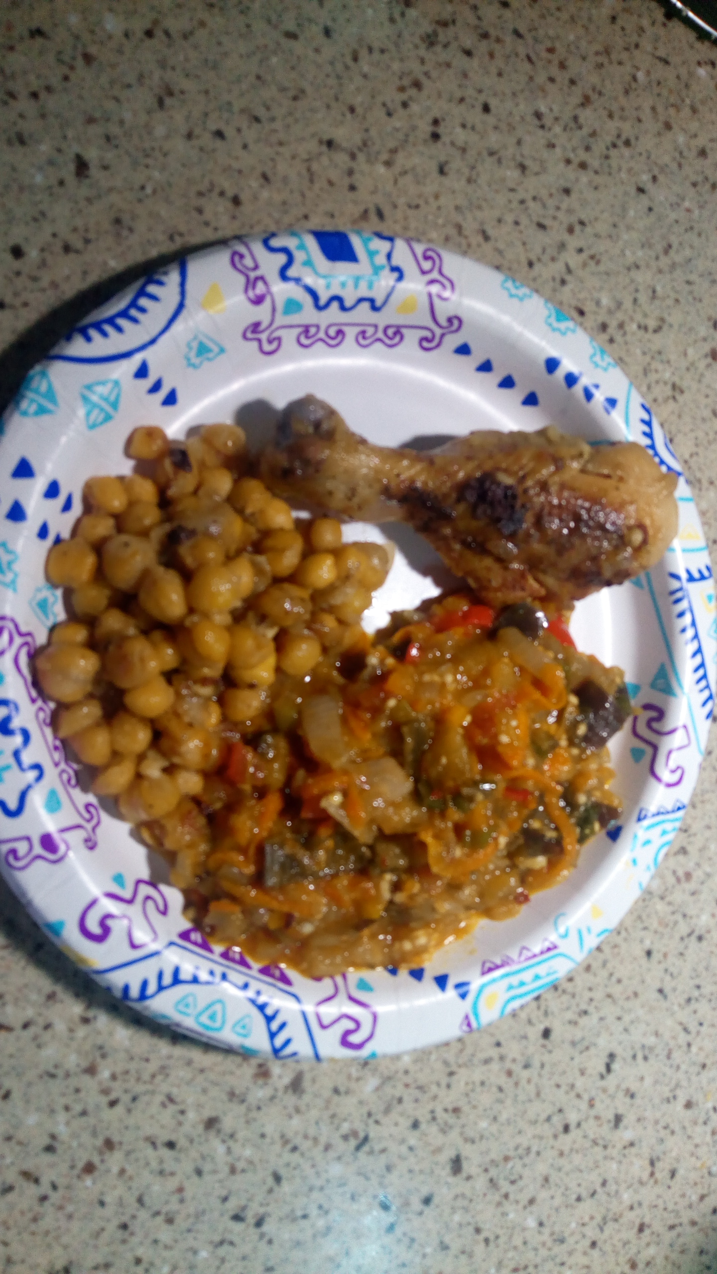 Вот мой обед-ужин. Овощная икра (лук, морковь, баклажан, сладкий перец, томаты, чеснок, зеленый лук и приправы). Куриные ножки с чесноком и горчицей. Нут.