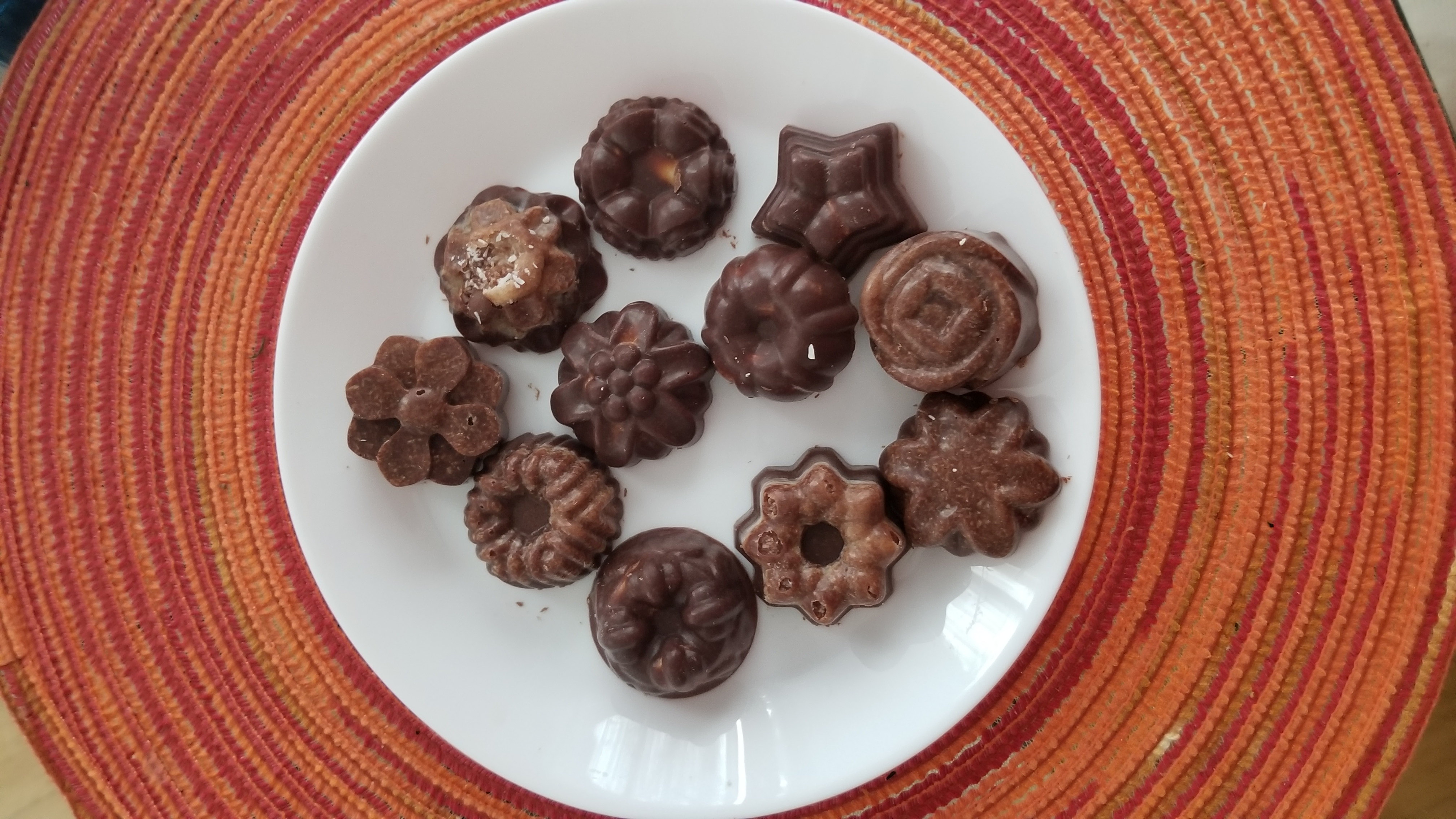 100 г какао масло (cocoa butter) 3 ст.л. raw cacao powder 2 ст.л. жирных сливок 2 крохотных скупа монкфрута (он в упаковке шел) 2 миндаля или 1/2 ч.л. кокосовый стружки в каждую конфетную формочку