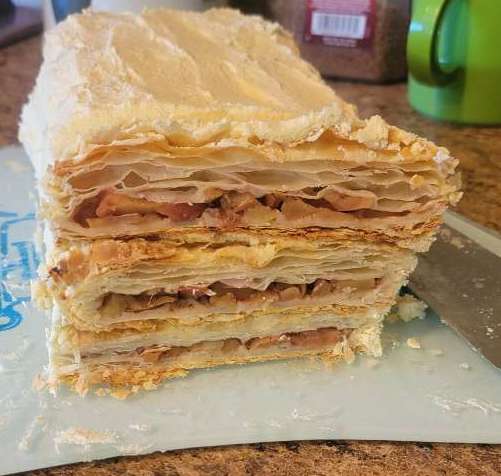 вдохновленная видосиком про баварский яблочный торт-пирог https://www.youtube.com/watch?v=ho5BlQQ1fqU&t=953s , вот на что сподобилась: "чебуреки" из вивалкиного "wewalka puff pastry" слоеного теста.  яблоки не томила, а мелко покрошила соломкой и заправила корицей, мускатом. за 25 мин выпекания при 200Ц все размягчилось и без предварительного томления в заварной крем сахара положила совсем мало. на вкус получился наполеон с яблоками.
