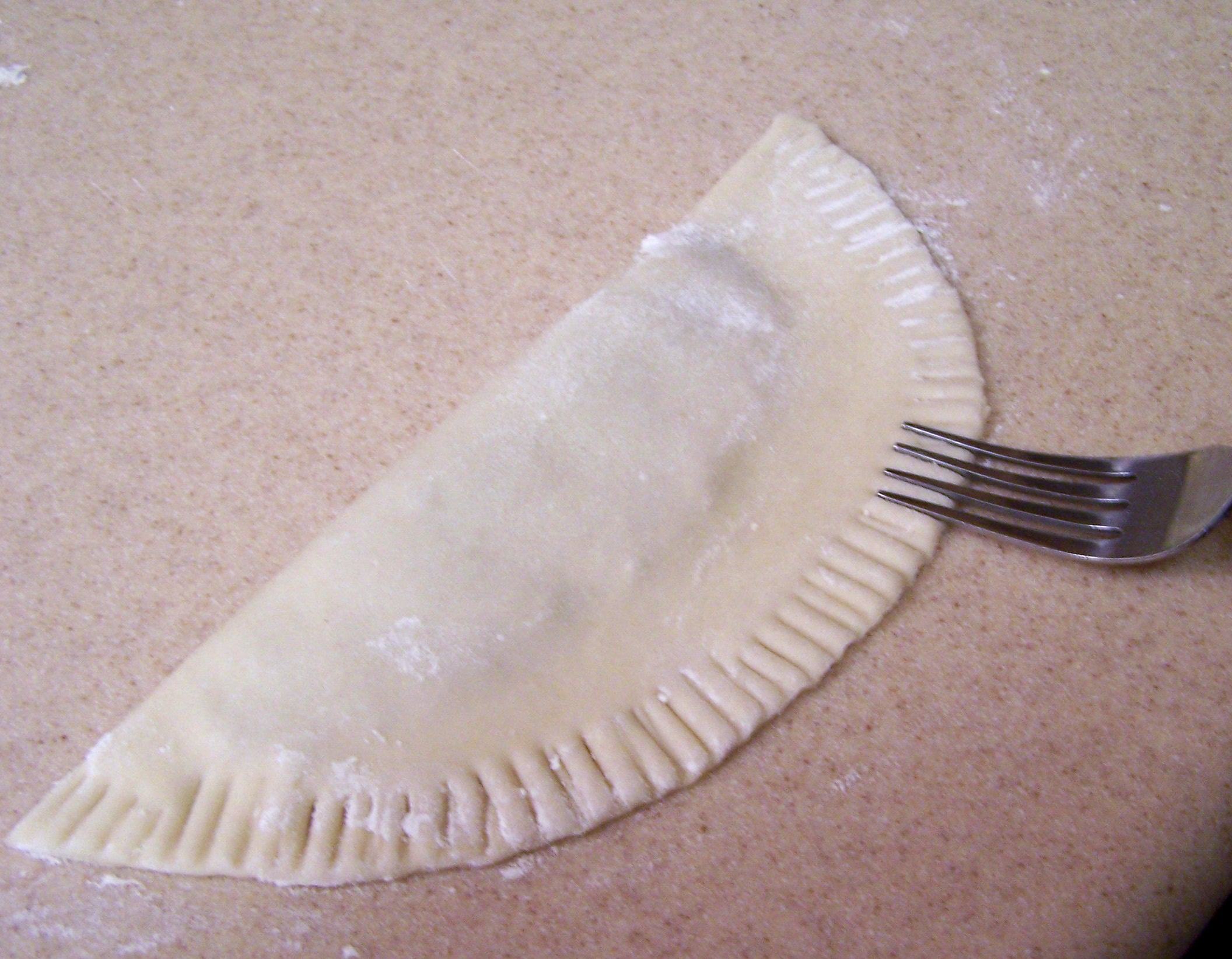 По краю чебурека при помощи вилки сделать кайму, прижимая вилку к тесту.