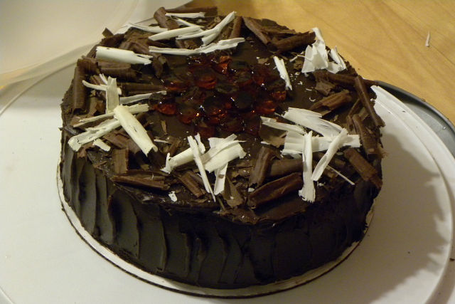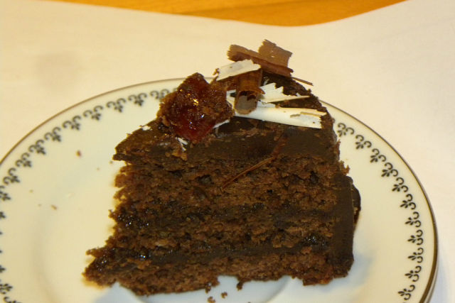здесь начинка получаеся как начинка трюфель шоколад и брэнди и слой малинового желе. Я думаю вы могли бы заменить на горький щоколад без сахара и на более кислое желе. Я, честно говоря, не люблю шоколадные торты (только Пражский любила раньше) но именно этот пришелся ко двору и хочу его повторить. И я не обмазывала сверху ганашем потому что этой трюфельной начинки хватило, даже по фото видно. Можно ганаш сделать с минимумом сахара тоже. Вот фото разреза (последний стыдливый кусочек:)))