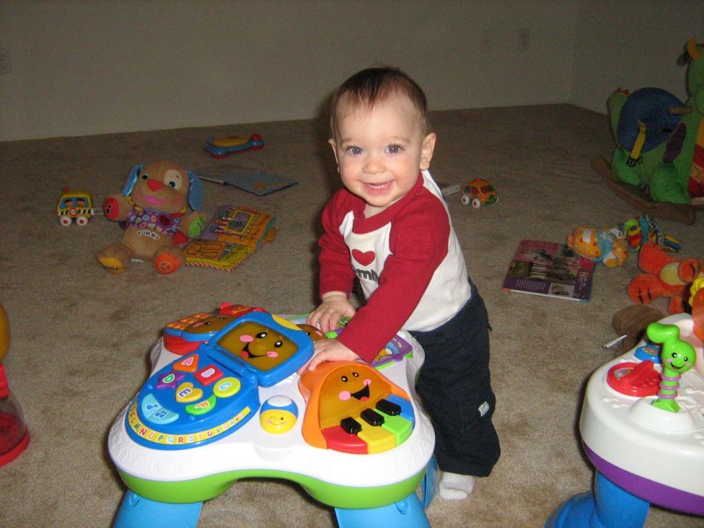 Ваши детки играют с activity table/cube? Мы ходили к физикал ферапист и она сказала, что деткам хорошо играть стоя, опираясь на что то типа такого столика. Я вот думаю, может ей куб деревянный с игрушками купить а не столик с кнопками? Что посоветуете? Лакими, у нас это одно из любимых занятий, до сих пор стоя играет, правда, уже меньше, так как больше возможностей появилось  У нас две игрушки такого плана: пианино и акитиви тейбл. Пианино сын вообще полюбил нежной любовью, когда на рождество его получил (ему 8 месяцев было), причем он никогда с ним сидя не играл - только стоя, а чуть позже для разнообразия активити ьтейбл купили, так как я видела, что ему очень нравится что-то в этом роде. Вот несколько фоток: