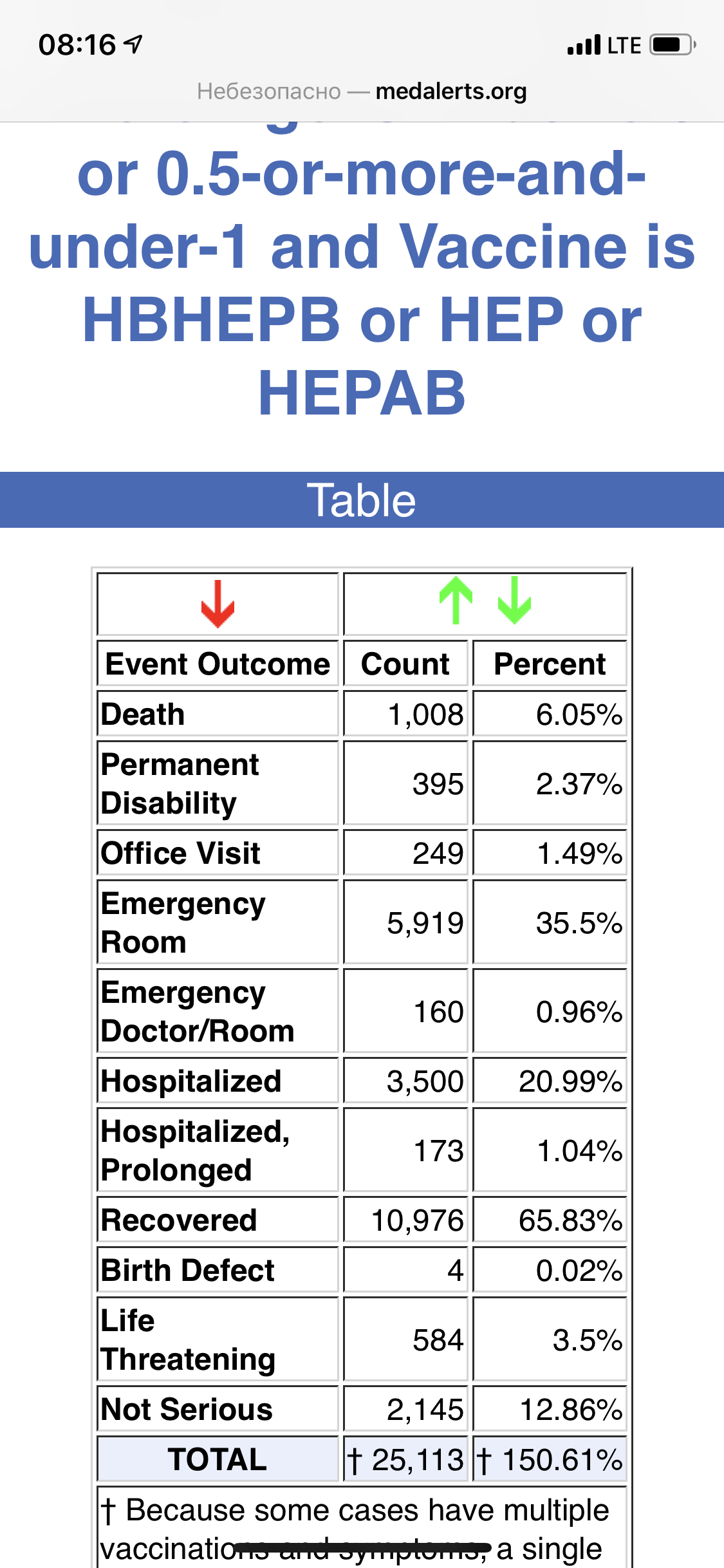 В VAERS зарегистрированы 999 смертей детей до года и 390 случаев инвалидности после прививки от гепатита В в США. (то есть реальное количество в 10-100 раз больше)