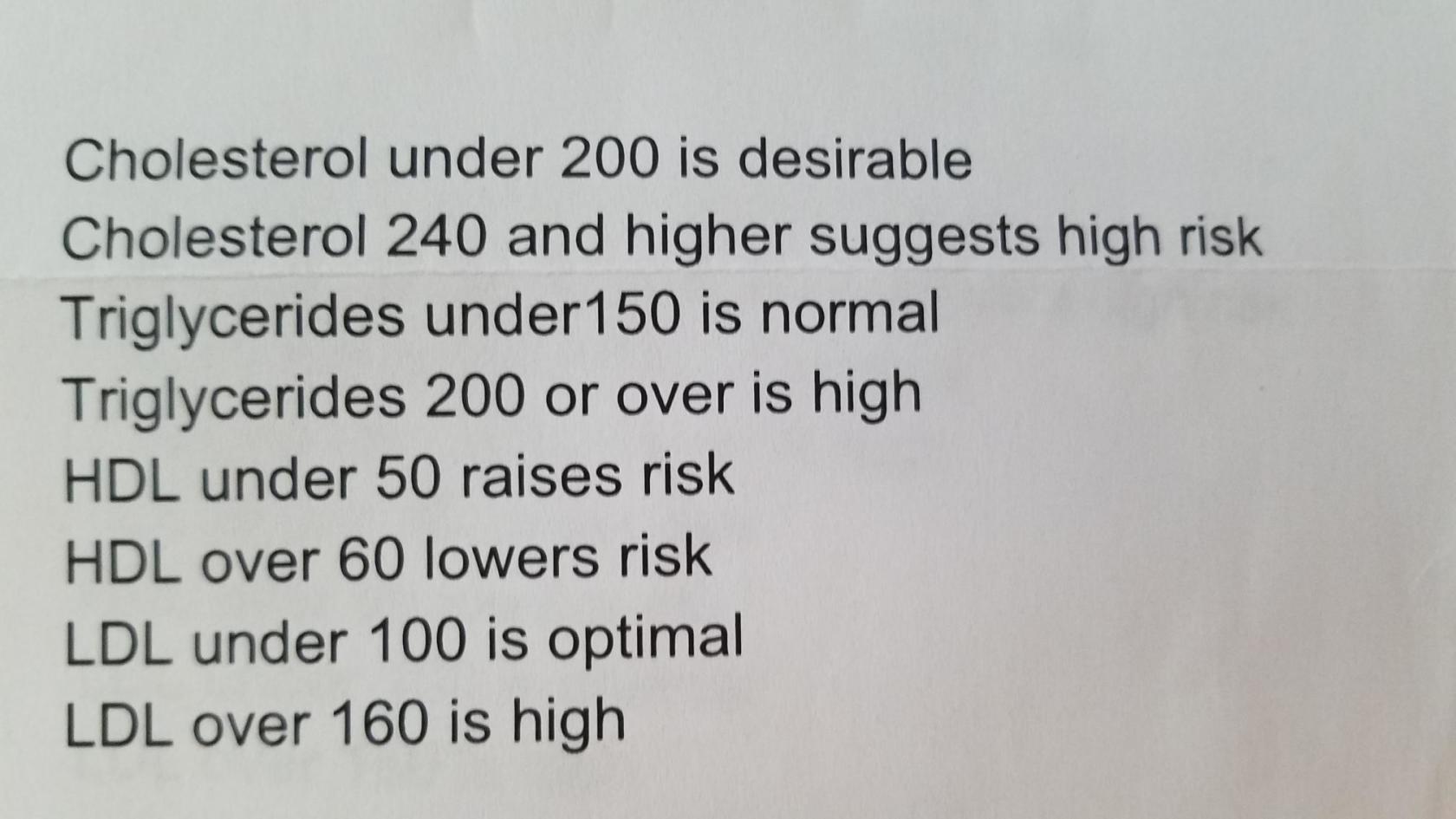 Nicole+ писал(а): ядан писал(а): Вчера мне позвонили об результатах мои анализов. Картина такая: щитовидка и сахар в норме, холестерин высокий.  HDL 47.0; LDL 153. Я в шоке и это при том,  LDL 153- не высокий, а на границе.. высокий 160-189 HDL - не высокий у вас Recommended HDL range Typically, doctors recommend an HDL level of 60 milligrams per deciliter (mg/dL) of blood or higher. HDL that falls within the range of 40 to 59 mg/dL is normal, but could be higher. Having HDL under 40 mg/dL increases your risk of developing heart disease. Спасибо, Николь, немного отлегло  Медсестра сказала что HDL низкий, надо поднять. Вот таблицу сфоткала, где они разъясняют всё, рядом с моими результами 5 лет назад.