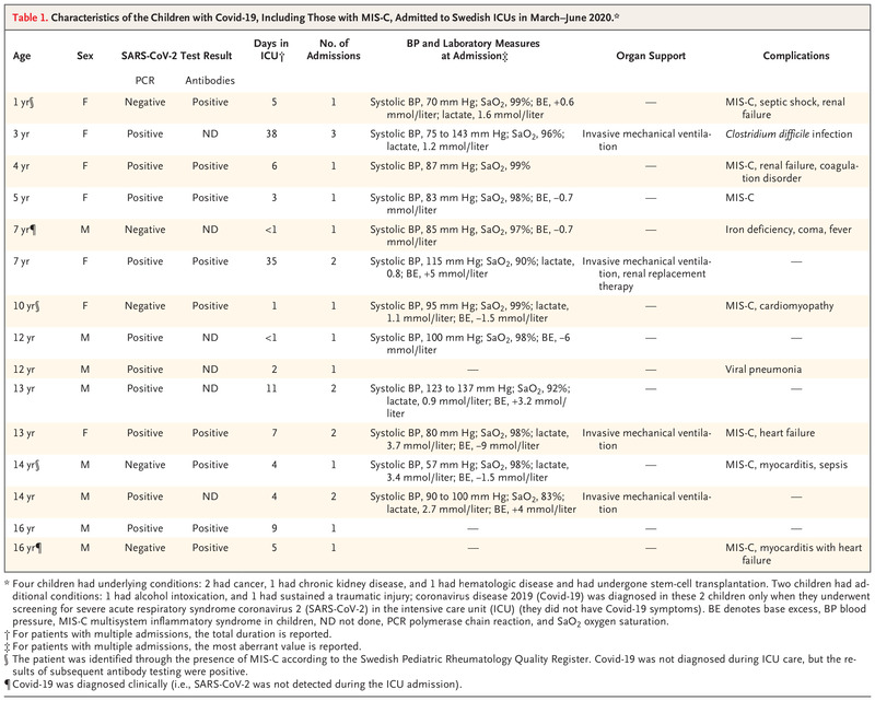 Characteristics of the Children with Covid-19, Including Those with MIS-C, Admitted to Swedish ICUs in March–June 2020. The number of deaths from any cause among the 1,951,905 children in Sweden (as of December 31, 2019) who were 1 to 16 years of age was 65 during the pre–Covid-19 period of November 2019 through February 2020 and 69 during 4 months of exposure to Covid-19 (March through June 2020) (see the Supplementary Appendix). From March through June 2020, a total of 15 children with Covid-19 (including those with MIS-C) were admitted to an ICU (0.77 per 100,000 children in this age group) (Table 1), 4 of whom were 1 to 6 years of age (0.54 per 100,000) and 11 of whom were 7 to 16 years of age (0.90 per 100,000). Four of the children had an underlying chronic coexisting condition (cancer in 2, chronic kidney disease in 1, and hematologic disease in 1). No child with Covid-19 died. Data from the Public Health Agency of Sweden (published report5 and personal communication) showed that fewer than 10 preschool teachers and 20 schoolteachers in Sweden received intensive care for Covid-19 up until June 30, 2020 (20 per 103,596 schoolteachers, which is equal to 19 per 100,000). As compared with other occupations (excluding health care workers), this corresponded to sex- and age-adjusted relative risks of 1.10 (95% confidence interval [CI], 0.49 to 2.49) among preschool teachers and 0.43 (95% CI, 0.28 to 0.68) among schoolteachers (see the Supplementary Appendix). The present study had some limitations. We lacked data on household transmission of Covid-19 from schoolchildren, and the 95% confidence intervals for our results are wide. Despite Sweden’s having kept schools and preschools open, we found a low incidence of severe Covid-19 among schoolchildren and children of preschool age during the SARS-CoV-2 pandemic. Among the 1.95 million children who were 1 to 16 years of age, 15 children had Covid-19, MIS-C, or both conditions and were admitted to an ICU, which is equal to 1 child in 130,000. Jonas F. Ludvigsson, M.D., Ph.D. Karolinska Institutet, Stockholm, Sweden jonasludvigsson@yahoo.com Lars Engerström, M.D., Ph.D. Vrinnevi Hospital, Norrköping, Sweden Charlotta Nordenhäll, M.D., Ph.D. Swedish Association of Pediatric Rheumatology, Stockholm, Sweden Emma Larsson, M.D., Ph.D. Karolinska Institutet, Stockholm, Sweden Disclosure forms provided by the authors are available with the full text of this letter at NEJM.org. This letter was published on January 6, 2021, at NEJM.org.