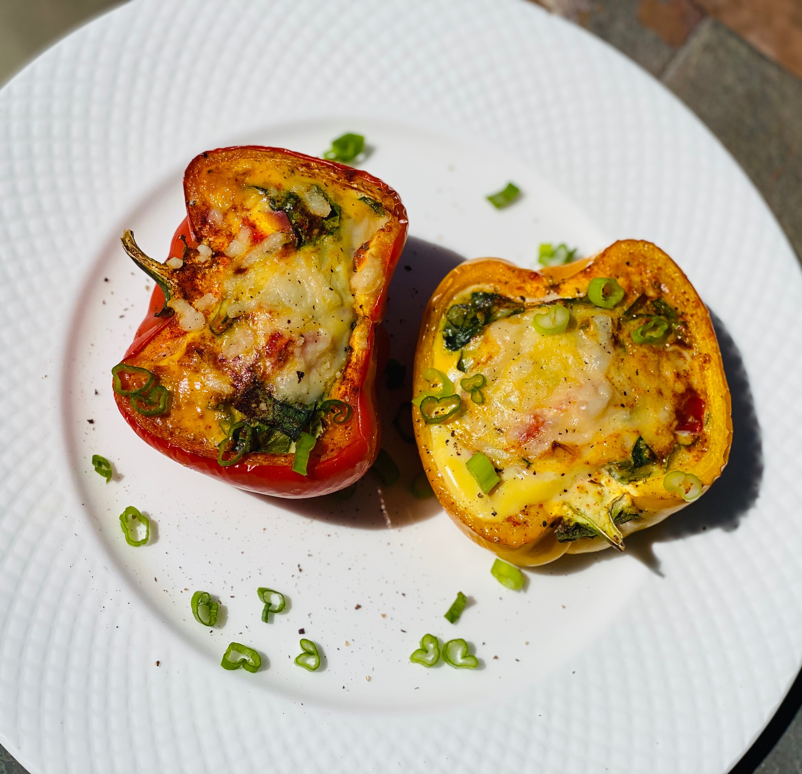 keto Italian peppers with scrambled eggs, heavy whipping cream, tomatoes, spinach and onions with smoked paprika and Mozzarella cheese. 420 F 15-20 min