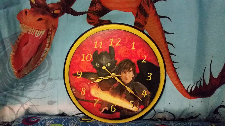 Наконец-то сделала одну из своих задумок- настенные часы с героями фильма How to train your dragon. Заготовки для часов покупала в Майклс, а картинку взяла из салфетки для детских парти.