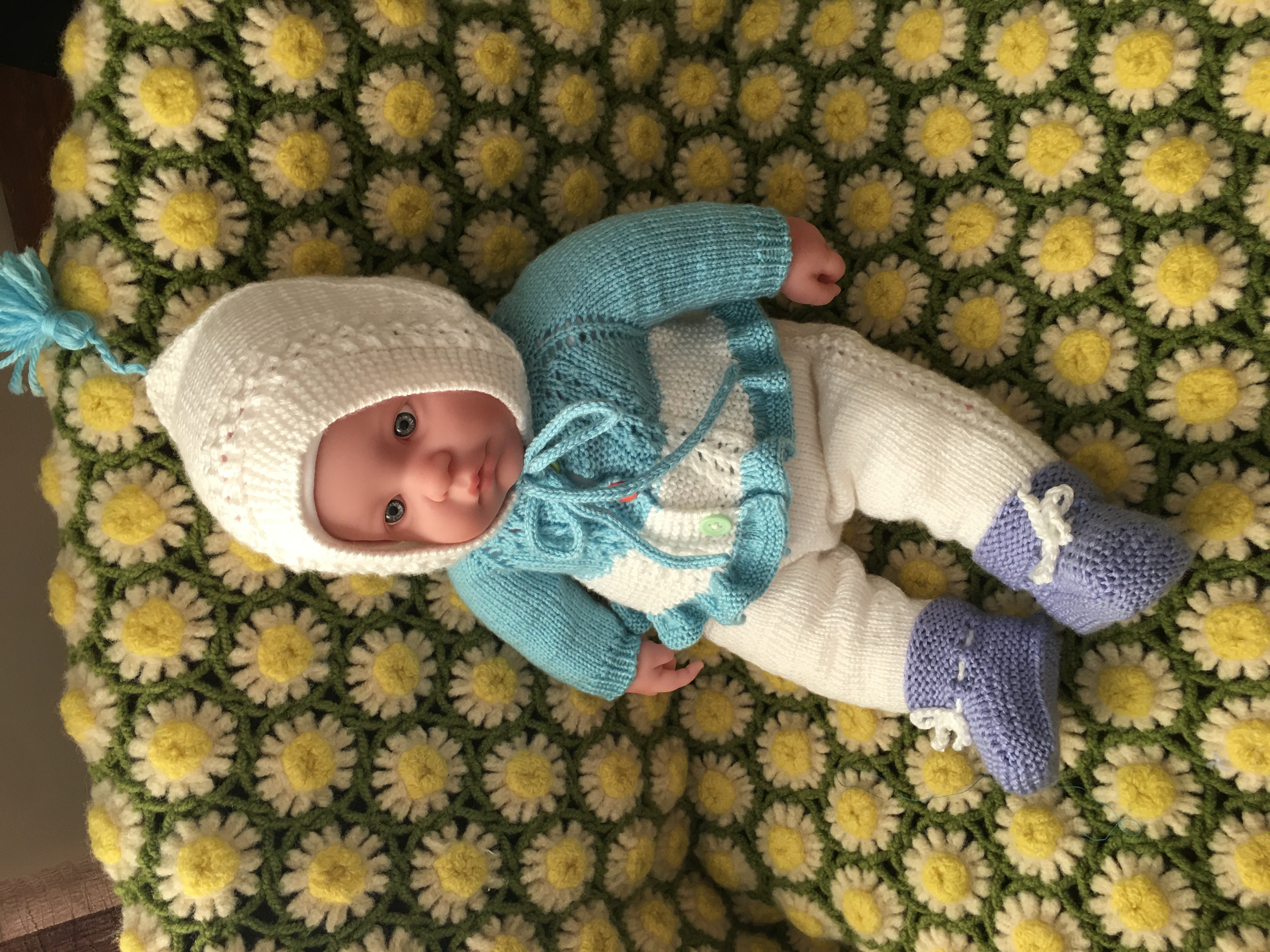 Update. Всю куклу обвязала. Даже пинетки, подбираю остатки пряжи. Теперь вяжу ей дайпер бэг для ее бутылочки с молоком.