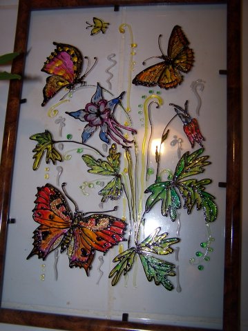 А я для презентов часто картинки на стекле рисую, детские краски для витража на основе ПВА по-видимому.