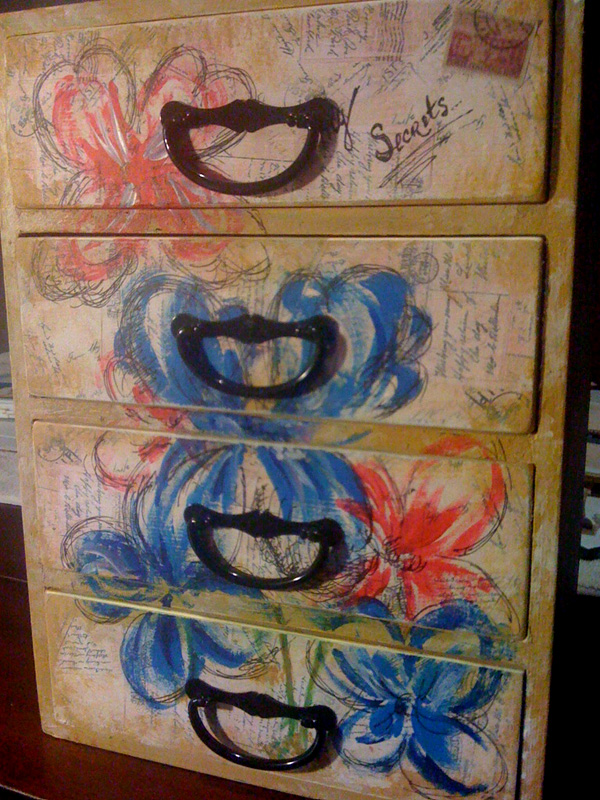 Я тут пытаюсь между делом комодик в винтажном стиле оформить. Сегодня сделала с маками, хорошо смотрелось, уже было собралась закончить... и оказалось, что я местами перепутала ящики, некоторые были перевернуты  Открываешь, а там - ДНО  Пришлось все снова отклеивать, переделывать, но на маки сил уже не было (они у меня были вырезаны и приклеены типа декупажа), от руки нарисовала цветуечки акрилом и тушью. Теперь вот думаю, не сильно ли аляписто получилось? Я завтра получше фотку сделаю, при свете дня. П. С. Оказалось еще, что лак, который я на распродаже взяла, красный  Причем это сзади мааааленькими буковками написано. Тьфу, придется за новым ехать. П. П. С. Как этот шкафчик по-английски называется правильно? Он настольный, для мелочей. Не могу слово подобрать, все не то.
