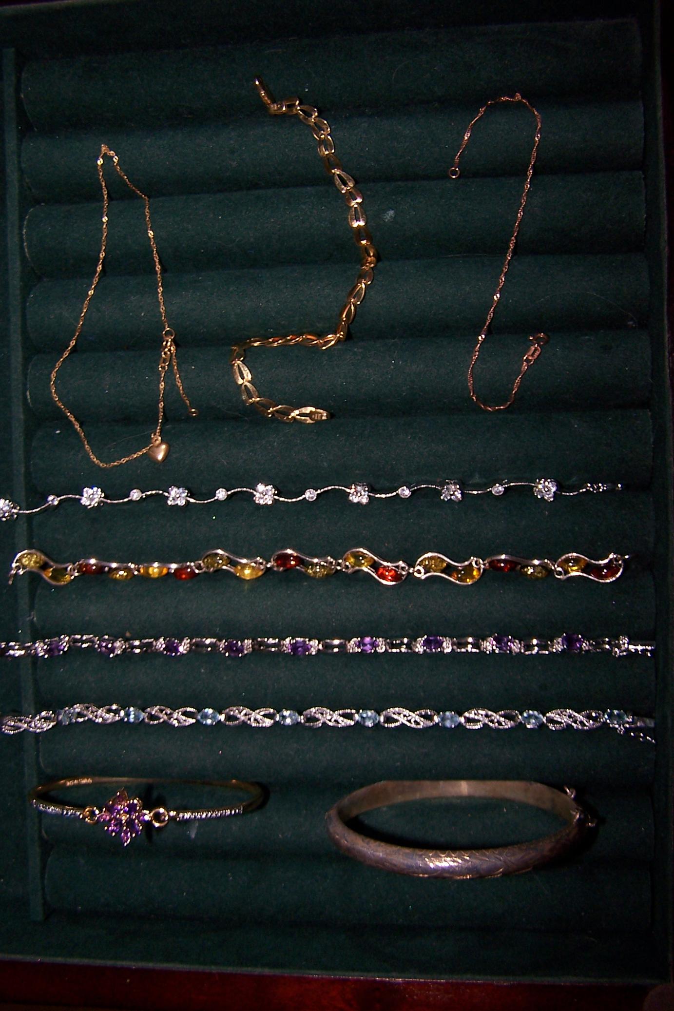 Мне хоть и особо хвастаться нечем. Но сильно хочется пять копеек вставить. Ведь мы не только о брУллиантах, но и о побрякушках. Это то что ношу постоянно. Самое любимое. По металлам не разбирала. В основном белое золото и серебро. Немного желтого золота. Между аметистов с цитринами встречаются дымчатые бриллианты и платина. Кого что заинтересует сделаю крупную фотку. И еще муж намекнул на подарок на годовщину, так что завтра отпишусь что досталось :) Самая большая страсть - серьги, и менее всего привлекают браслеты, что видно из количества. Фотки припоганые, цвета переврались. Но лучшей камеры нетути. Сразу говорю, металлы - белые, также как и жемчуг (на фотке желто-розовый)