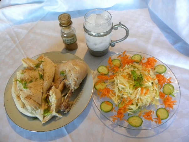6 день Завтрак: черный кофе. Обед: 500 г вареной курицы, салат из сырой моркови или свежей капусты. Ужин: 2 сваренных вкрутую яйца, салат из сырой морковки с растительным маслом. Кто считает эту диету голодной?! наверное только трудно работающий человек или диета унисекс. Женщине столько слопать в желудок не поместится. Специально взвесила Это 500 г курицы и 100 г салата. Осилила половину (ножку и немного грудки) и пол салата. Забытая тяжесть обжорства и тянет в сон. (вчерашняя рыба такой же была - боюсь на весы становиться завтра) Сверху немного фенхеля а та варенная курица как-то жалко выглядит попробовала кайенский перец, (нашла в старых запасах мужа ), пока так себе, но может он старый... Он должен пахнуть?