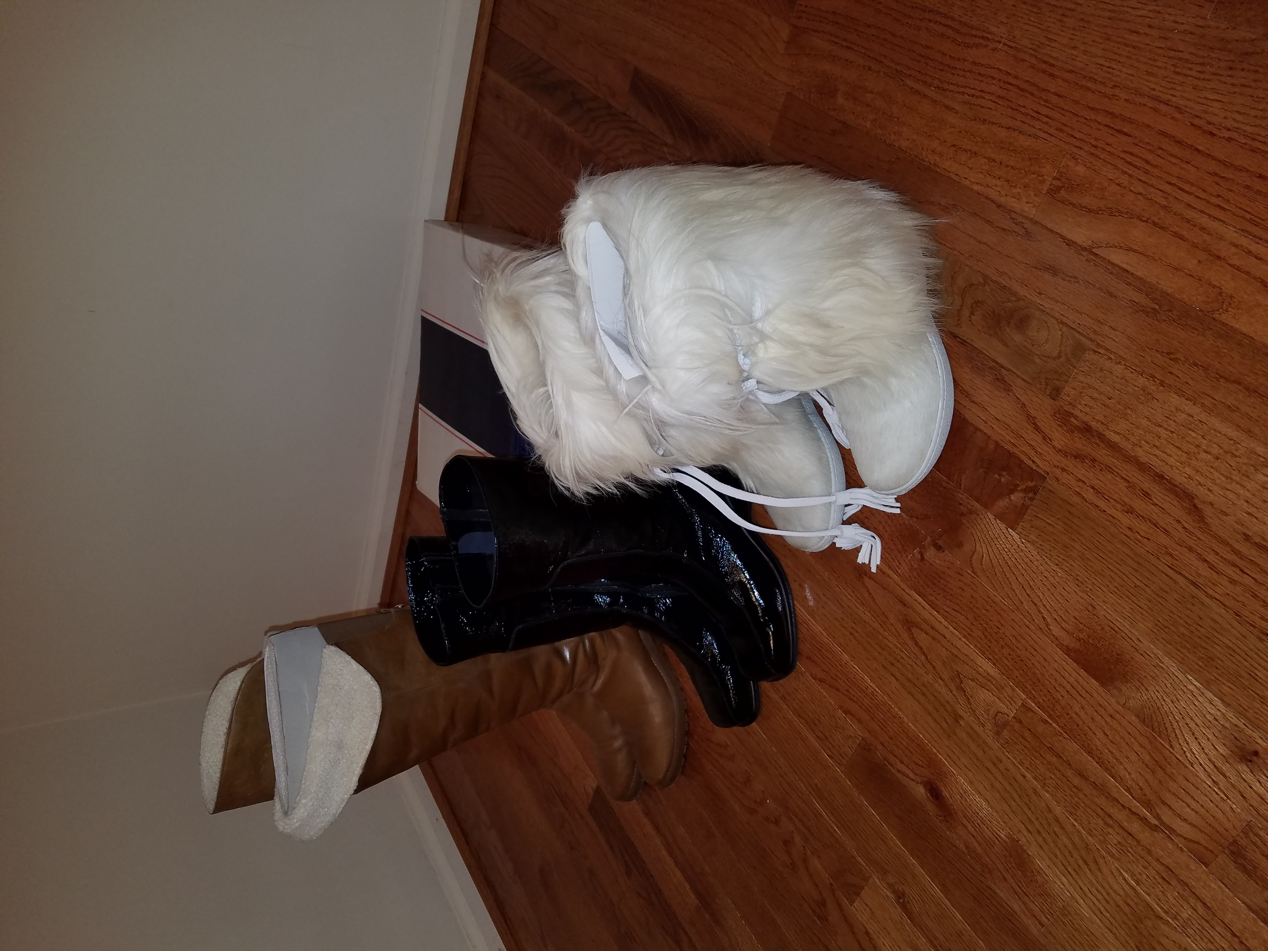 Черние патент-Ла Канадиен. Хороши для межсезонья, вотерпрув. Белие из козла -Пояр. Не знаю почему купила, не знаю как носить. Может кто подскажет. У нас афроамер питаются дешевие из меха носить. Мои -Итальянские, дорогие. Мне кажется я буду как чир лидер. Вообше они для пост скии активити.