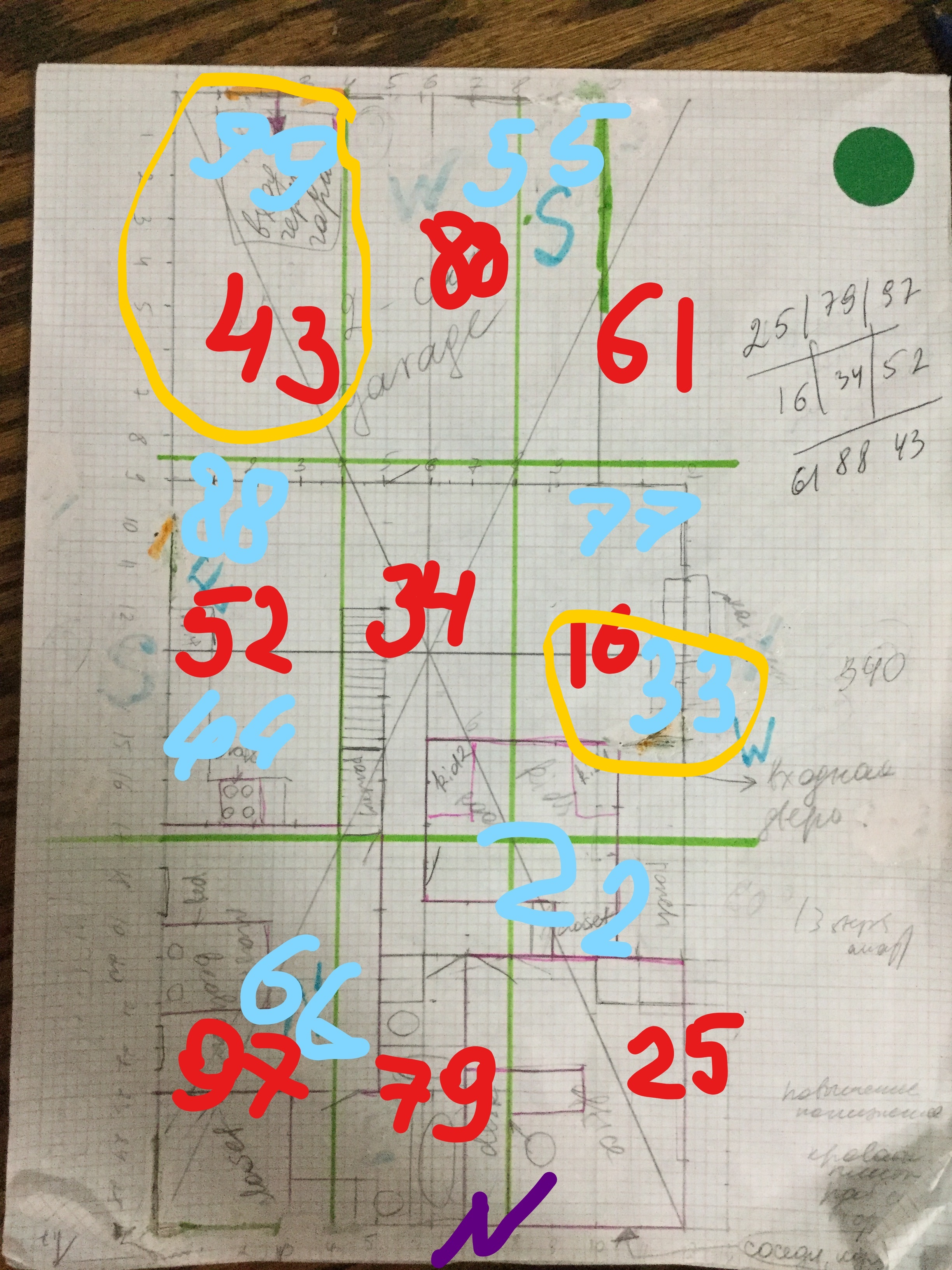 Верно. Они еще и быстрые. А также являются детонаторами для звезд дома. У вас вот 52 на фасаде, нету там особой активности, вот оно себе и спит если нету дубликатов. Когда придет туда 2 годовая в следующем году, то запустит эту двойку точно. Это может быть быстрое развитие какой то болезни хронической. Но вот в этом году у вас 3-ка там, это болезни связанные с востоком, левый бок, печень, еще там что-то. Двойку надо "удовлетворять" - к врачам ходите на профосмотр, пейте какие то витамины всей семьей регулярно. Как бы 2-ку мы не любим, но болеем все равно. Если там двойка в благоприятном окружении, то может принести доход от недвижимости. Это если 2-8. Тогда получается, что лучше ходить через правую дверь гаража (если смотреть на гараж), ведь там аж две девятки (99)! А то эти две тройки (входная дверь) еще же активизируют ссоры? я помню вашу карту дома. Вы опять все звезды перепутали. Я же вам писала несколько раз что через гараж не надо ходить. ... Я помню даже плюсиками отметила где хорошие комнаты. Вот ваша карта еще раз, уже с годовыми звездами - сохраните себе и берите ее за основу пока.