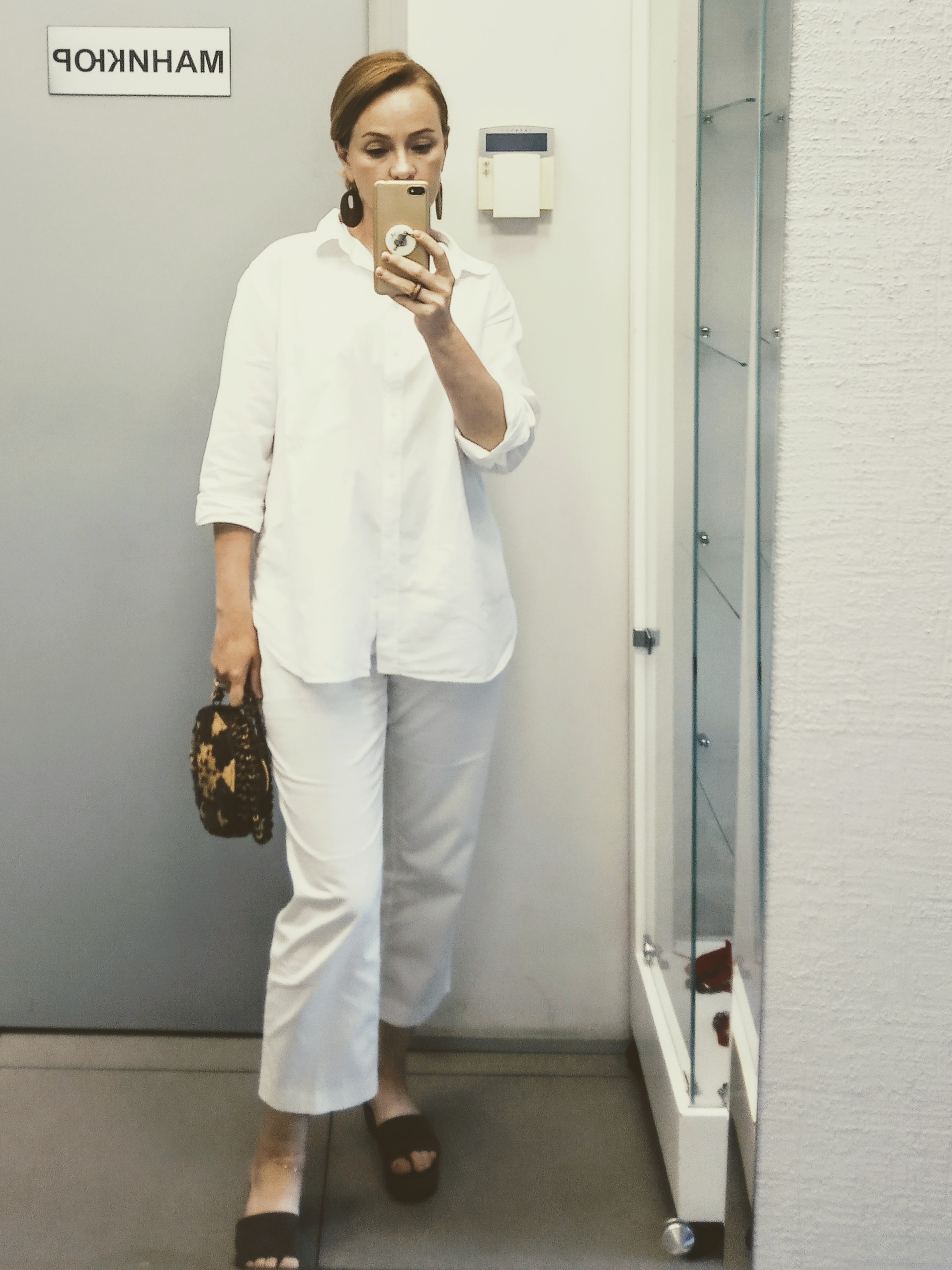 Незабудка, классно тебе ! Минимализм тоже полюбила, и монохром. Видимо это усталость от головоломки - как сочетать и комбинировать разные цвета и фактуры. Сумка прелесть. Ну и шлепки тесамые, зачётные Можно что-то под воротник продеть типа тонкой косынки или бус, причем даже белого/бежевого цвета или молочного, просто чтобы больше женственности придать,на мой вкус