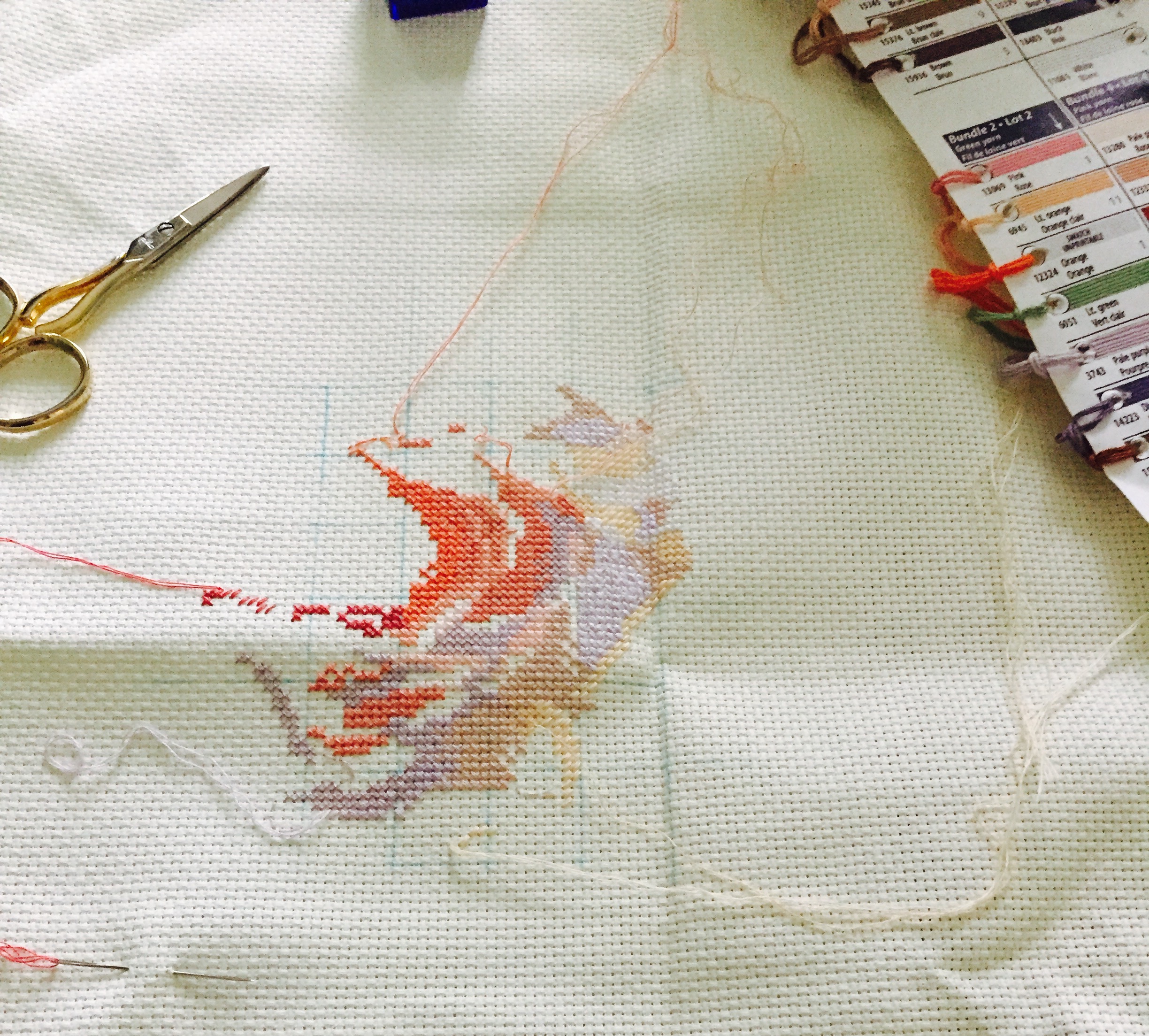 Bielita писал(а): Робин, вы не обрезаете нитки? Готовые уже есть? Покажите, если есть. Я уже с лета не вышивала. Вот разложила на полу схемы, хожу мимо них, все думаю начать новую вышивку, никак руки не берутся. Хотя знаю, как начнешь, трудно остановиться.  Это не оч маленькая вышивка, 16"x11", поэтому если реалистично, то скорее к концу года закончу. Те нитки, что не обрезаны, просто значит я тот цвет не дошила_ Мне надоедает вышивать долго один и тот же цвет, поэтому я оставляю длинную нитку (дошить позже) и берусь за другой. И кроме этого, я очень часто закрепляю нитки на лицевой стороне, поэтому коротенькие обрезки на лицевой стороне торчат пока не спрятала. Про схемы разложить и тд, у меня в вышивке подготовительный период как раз самый любимый. Разложить схему, посидеть над ней несколько вечеров помечтать откуда начну вышивать и в какую сторону, потом разложить нитки, подготовить канву и тд. )))