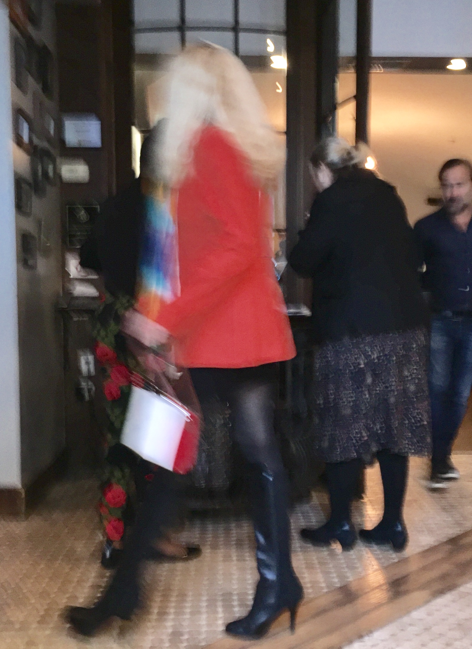 Наблюдала проходом в театре: Стоит девушка в белых высоких сапогах на каблуках, коротком платье- футляре в мелкую клетку и серого цвета, держит через плечо красную искусив шубку и позирует для фотосъемки, несмотря что люди вокруг. Вот это модница с выдержкой королевы!