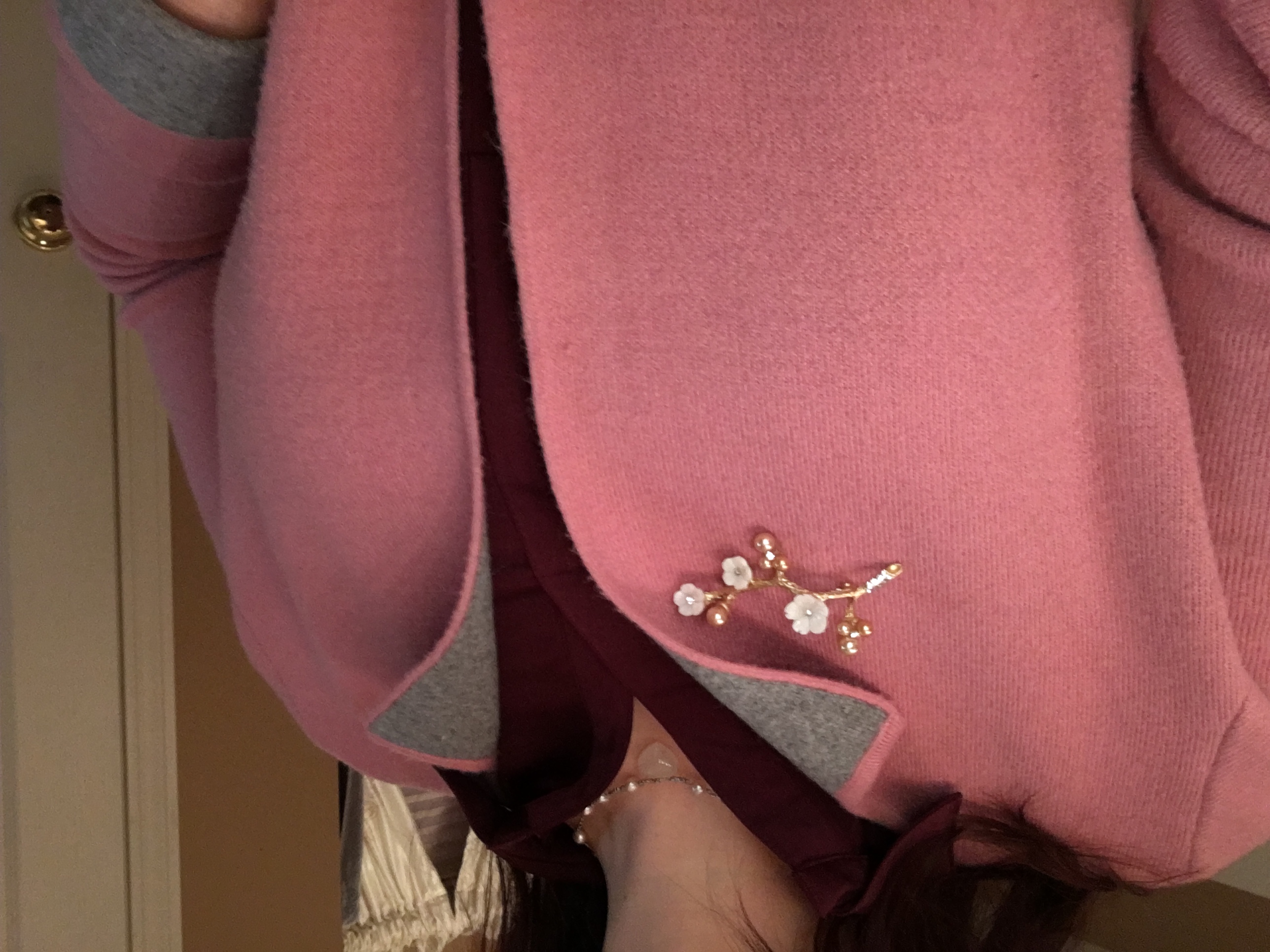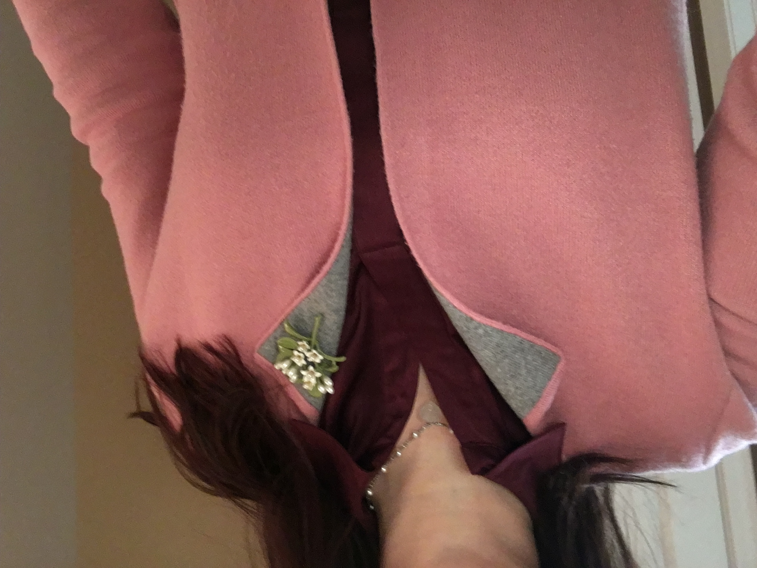 Биелит , красивые брошки , нежно смотрятся ( хоть и вверх ногами ))) . И жакет красивый , цвет нежный , пыльно-розовый . Видно что трикотаж хорошего качества , плотный , двухсторонний .
