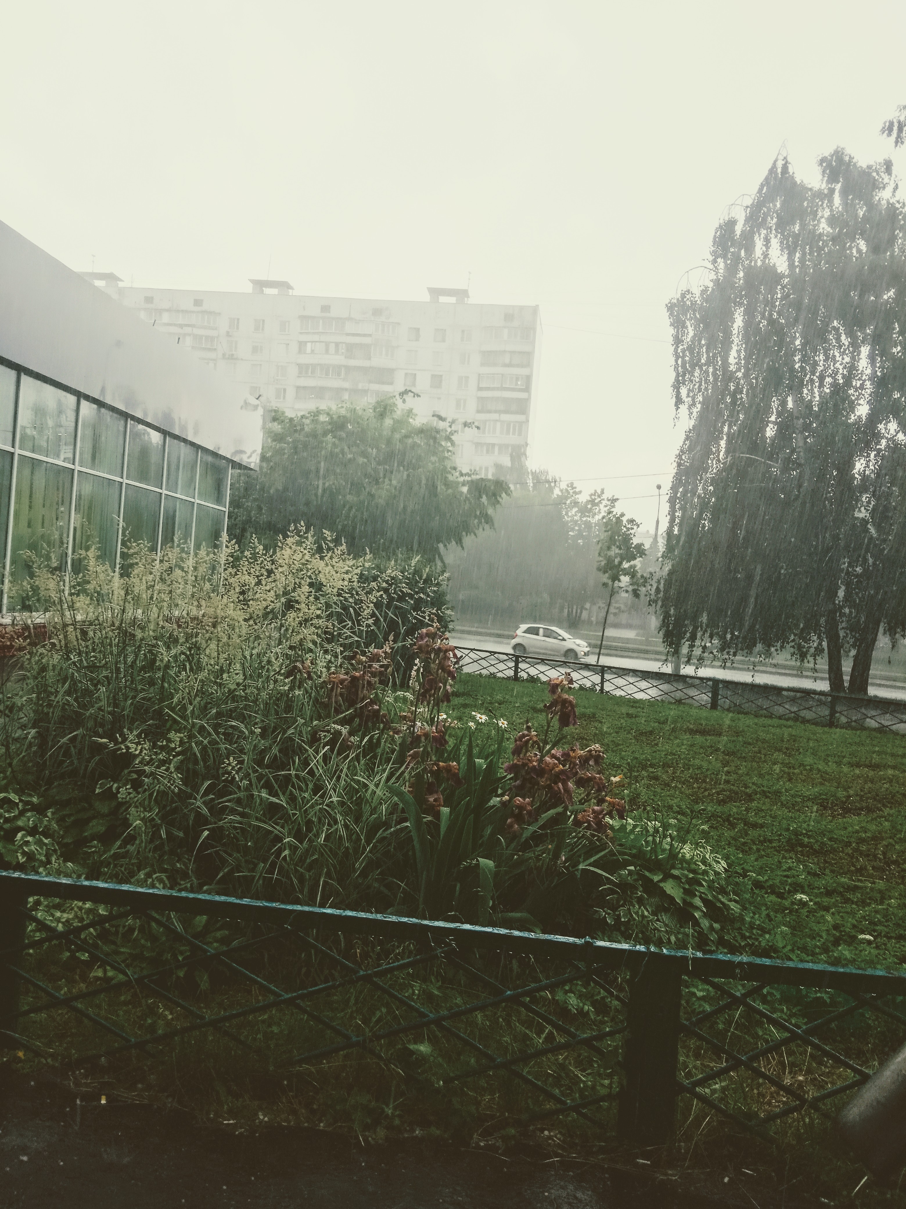 Мы насажали цветов, прелесть. Идёт град и просто трескается небо. Зато воздух сплошной озон