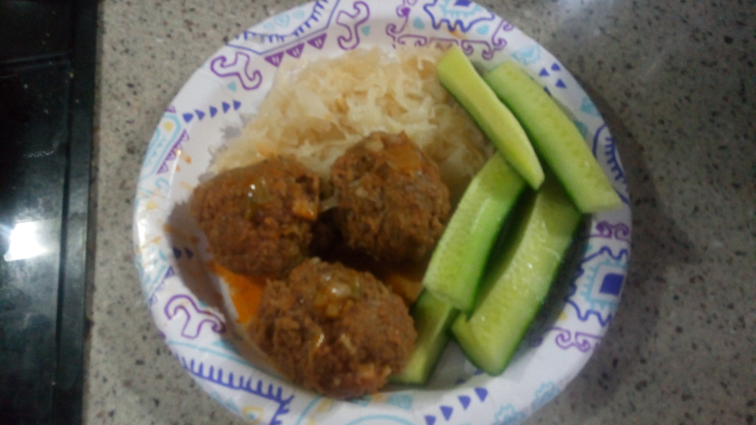 Тефтели (говядина , лук, чеснок и свежая капуста) тушились в томатном соусе. К ним квашеная капуста и огурцы. Так и не знаю, что с квашеной капустой можно. С мясом ОК?