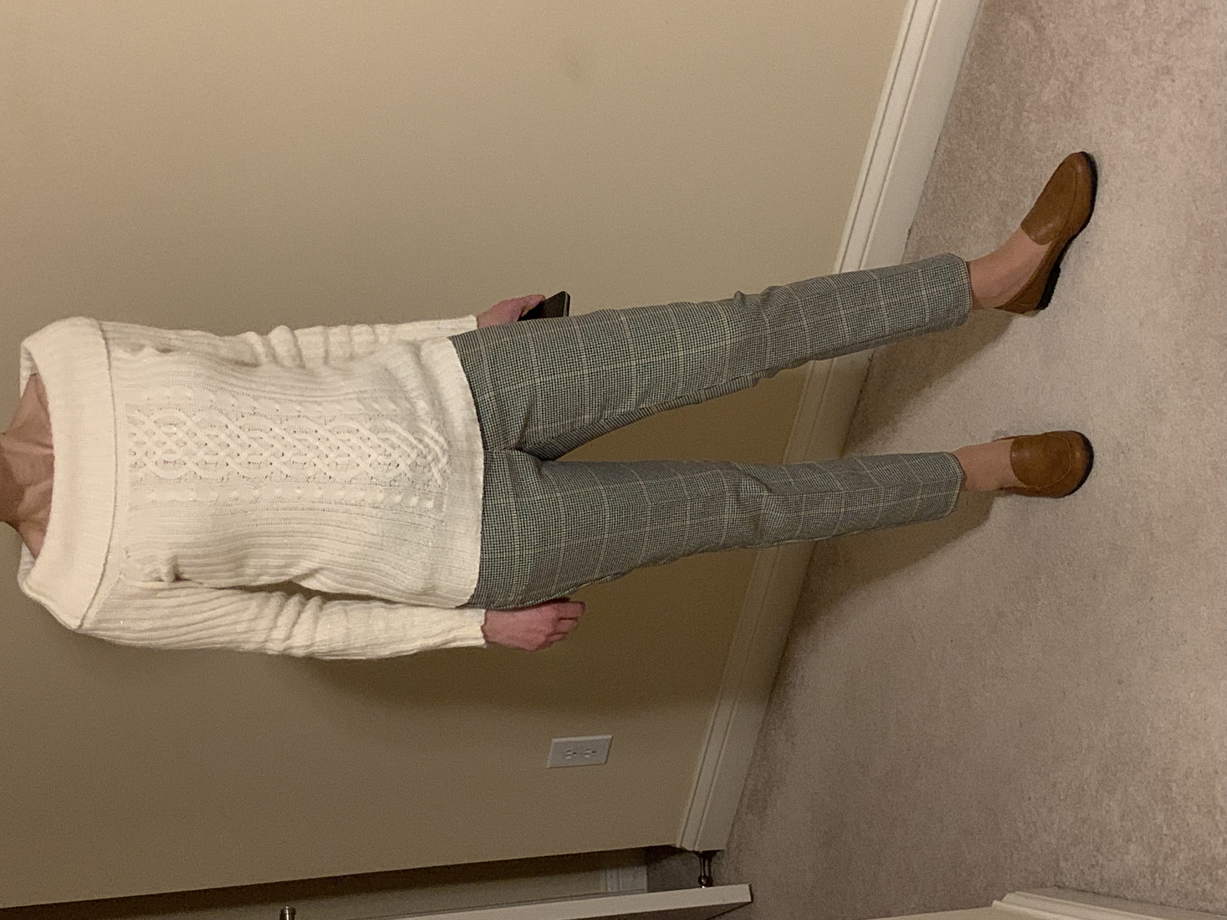 Серые в клетку- понра! Хорошо сидят. Свитер нужен bulky к ним. Если выбирать между первыми и в клетку- клетка однозначно.