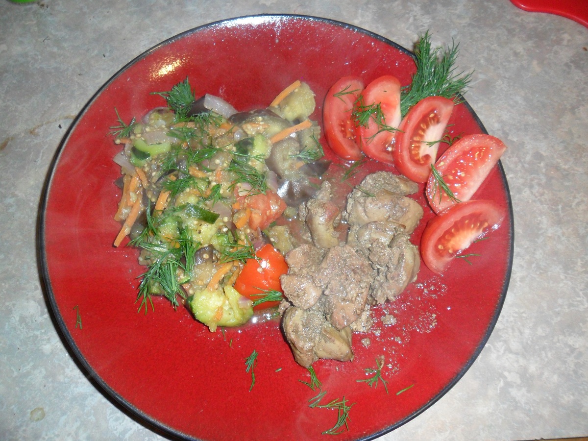 тушеные баклажаны, цуккини, помидоры, морковь, красный лук и специи куриная печень
