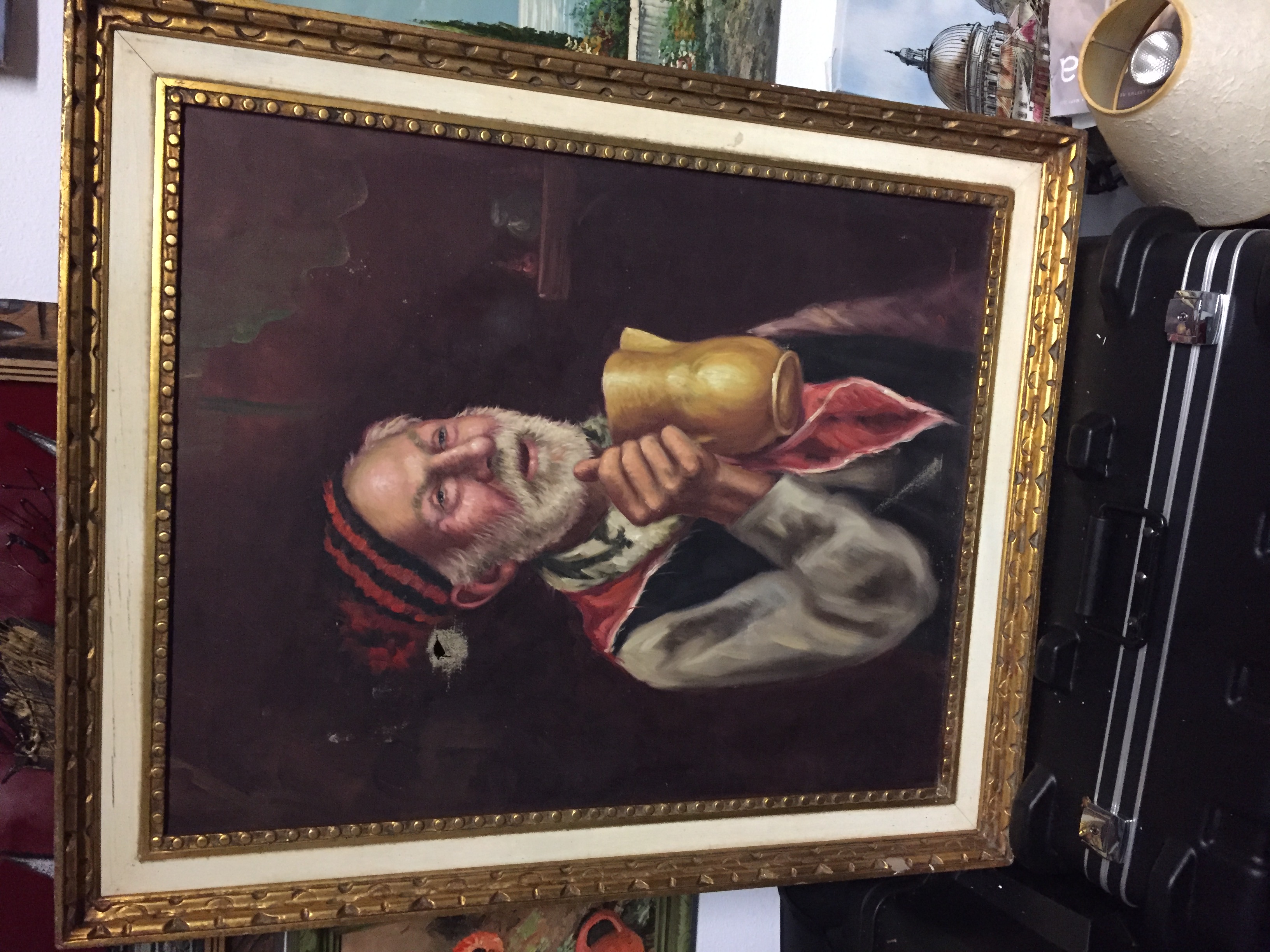 Отличная тема, так скучаю по Антик, винтаж и наши сокровища...подсадили на ярд сейлы с тех пор... Вот -с картиной сегодня после ярд сейл, вижу -старая, порватая даже , но понравился мужичок, надпись не разберу....может кто подскажет...