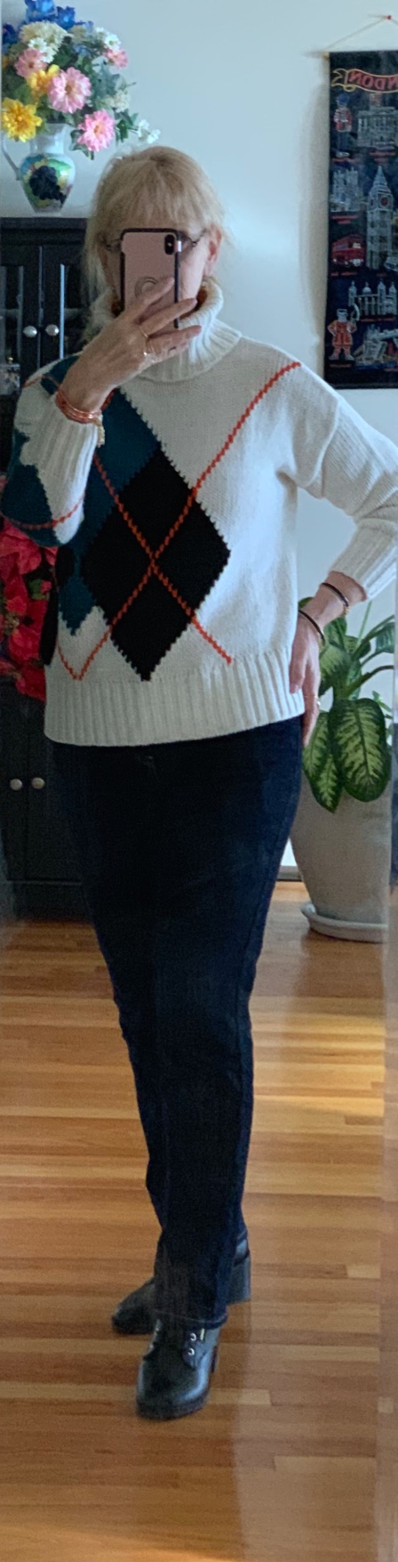 3. Этот свитер мне нравится больше всех - много белого! высокий ворот! Мне всегда холодно, если шея открыта. Плюс есть модный яркий и жизнерадостный цвет (living coral), плюс рисунок argyle, но решён асимметрично. Я надеюсь, на снимках видно, что рисунок по левой стороне свитера и заходит на спину, а справа всё белое. К этому свитеру подошёл простенький дешёвенький браслет того же кораллового цвета.