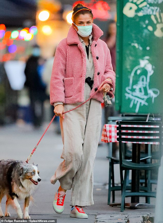 Pretty in pink: Helena Christensen, 52, added some color to her casual ensemble with a fuzzy pink jacket as she ran errands in NYC on Wednesday with her Australian Shepherd Kuma