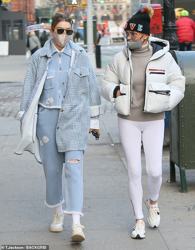 Gigi, 25, looked chic yet casual in an all-blue outfit featuring an eye-catching powder blue houndstooth coat, while her 57-year-old mother opted for a sportier look with a white puffer jacket.