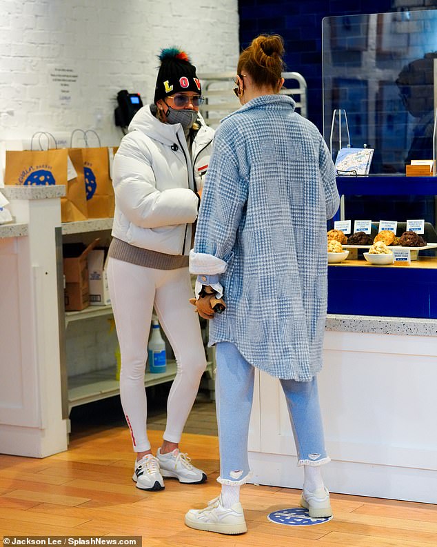 She stuck to the sporty theme with black and white New Balance trainers, and she stayed warm by topping her blonde locks off with a black ski cap reading 'LOVE' around the band.