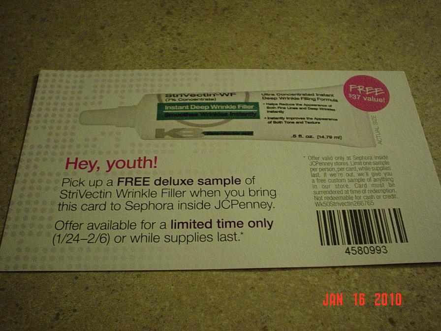 Asya,в нашем магазине после 2 февраля мало что хорошего останется.  То все слишком большое или же слишком страшное.  Вот сейчас в JCP Сефоре дают такие флаеры на бесплатный крем. Я туда зашла-вижу они около кассы лежат-попросила один-мне отказали,сказали,что надо что то купить,чтоб его получить. А потом я увидела в самом JCP около касс лежат целые кучи-бери не хочу-я прихватила парочку. Крем можно будет получить в Сефоре (только которая в JCP) с 24 января по 6 февраля. AB,а ты на их Reward programm не подписана? Я подписана и они мне каждый месяц на емаил сертификат присылают на $10 (даже не смотря на то,что я не шоппюсь на их $200 лимит в месяц)  .
