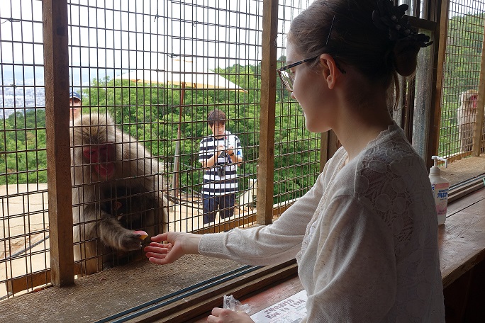 Я смотрю тоже, что Ами не ходила в обезьяний парк в Киото (иначе бы были впечатления и фотки  ) А вот мы сходили! Там обезьяны живут на свободе, просто их подкармливают, и поэтому они к людям относятся благосклонно. Хотя тоже предупреждают там обязательно - на корточки перед обезьянами не садиться, в глаза не смотреть, еду собой не приносить и обезьянам не показывать, еще там что-то. Потому как, хоть и кьютные, а все-таки дикие животные. Можно было их кормить, но только зайдя в специальный домик, когда между тобой и обезьянами - сетка, и только кусками яблок или орешками, что там в пакетах продавали. Обезьяны вообще никого не боялись, бродили тусовались прямо среди людей. Так что, вот такие фотки на память остались