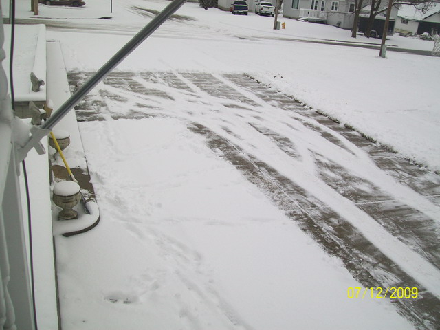 Моя тренировочная "база". Вот это я утром проехалась (вроде красиво :)), струсила, ушла домой, потом пробовала почистить снег - следы так и остались. Покаталась еще, поскользила, где-то раз из трех попыток въезжаю на место. Чаще всего "стукаю" "переднюю" машину