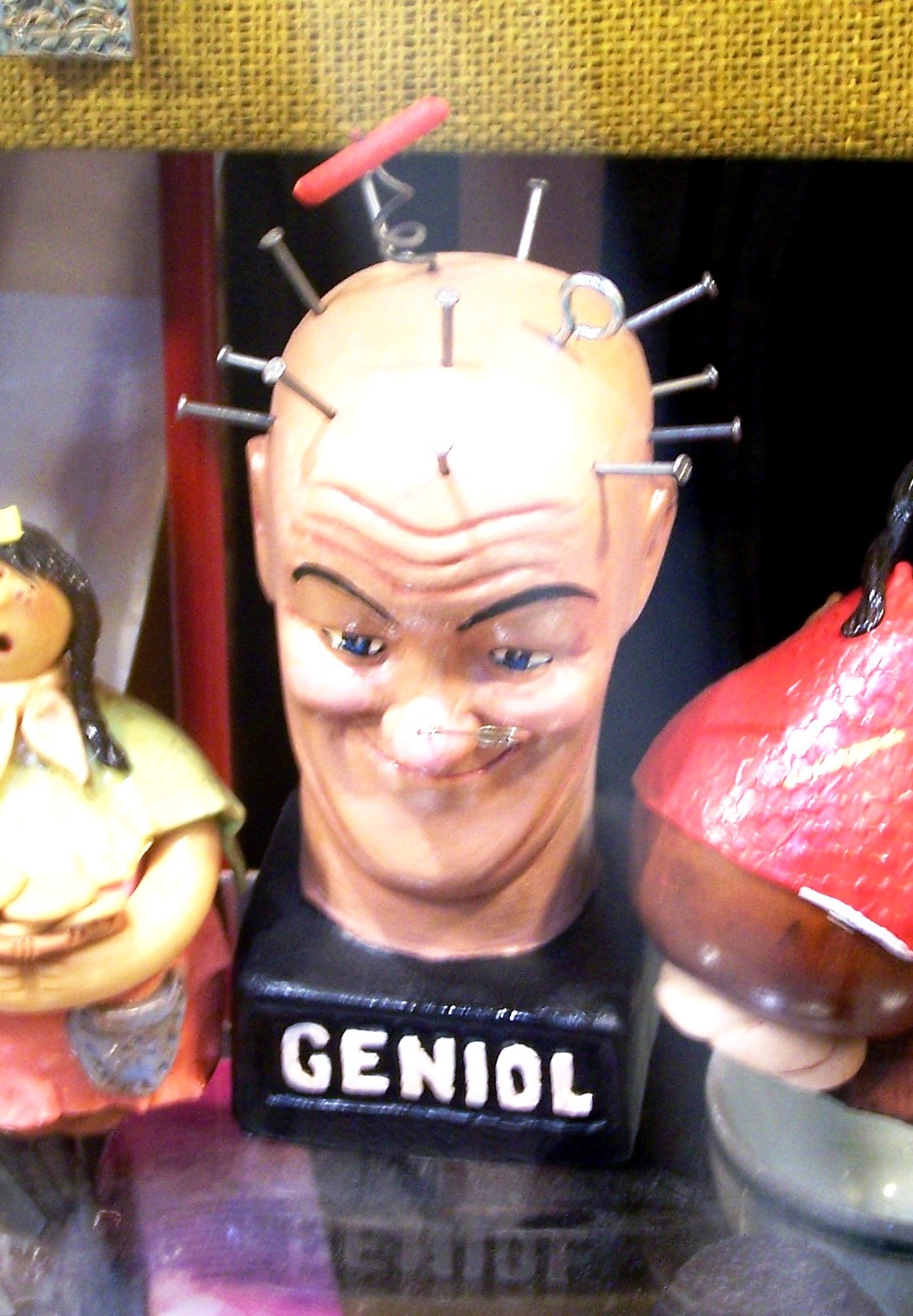Долго не могли понять: что это за голова такая - с гвоздями, штопором и булавкой в носу. Выставлена в витринах, на старых рекламных плакатах... Оказывается Geniol - это очень популярное болеутоляющее средство. В частности, хорошо помогает от головной боли.