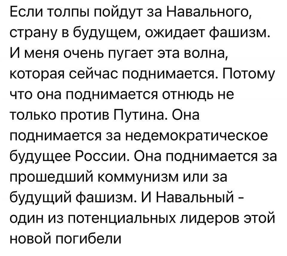 Insomnia писал(а): Dekabr писал(а): То, что выманивали детей на улицы , Россия им это не простит , в этом все россияне единодушны. У вас желание говорить за всех все увеличивается и увеличивается, я смотрю. Че мелочиться, высказывать только свое маленькое мнение? Лучче прямо так - сразу за всю Россию! Вам не понять , а я прямо сейчас в Москве . Общаюсь с людьми . Мама моя тоже в шоке от всего этого Моя подруга ходила на митинг 10 лет назад , поддерживала Навального , как и ее муж . Сейчас они его ненавидят , это настроение всех порядочных людей в России . Дети для страны -это святое . Организаторы приезда Навального и вывода детей - промахнулись . В России такое безнаказанно не пройдёт . Результат у них получился противоположный -сплотили всех россиян единодушно против этой мрази.