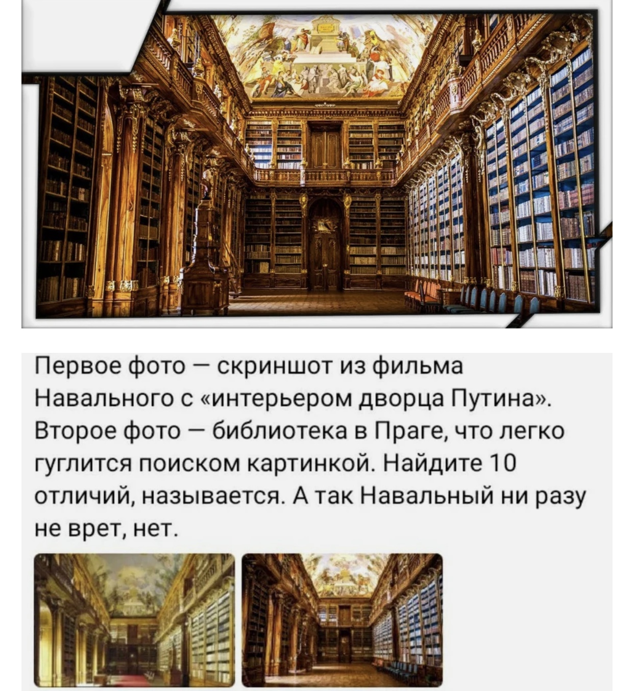 Dekabr писал(а): очередная ложь "расследования" Навального про "дворец Путина"Уже по видео видно, что фэйк про дворец рассчитан на полных лохов и школьников ))) Ребята сняли -один бетон везде , никакой мебели , никаких туннелей и золотых ёршиков ))) Например, про библиотеку , ну смешно же ))), скопировал библиотеку в Праге и так по всем комнатам , ничего там нет , голые стены . ))) офигеть , на такую примитивную ложь вестись )  Вы фильм то хоть смотрели? Или как Гуча Пастернака не читали? "В резонансном расследовании Навальный не утверждал, что изображения интерьеров пражской библиотеки — это фото дворца возле Геленджика. В фильме сказано, что это — иллюстрация с сайта итальянской фирмы, которая подчеркивает роскошь производимой ею мебели." https://www.stopfake.org/ru/fejk-aleksej-navalnyj-vydal-interery-prazhskoj-biblioteki-za-ubranstvo-dvortsa-putina/