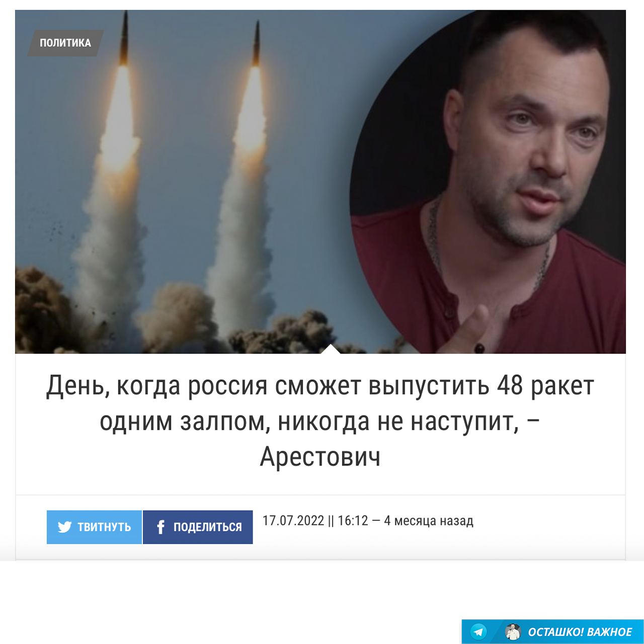 Baylee писал(а): Алексей Арестович не думает, что его «дерзкие, как пуля резкие» высказывания кто-то будет отслеживать Украинский ведун, пророк, советник, мольфар, эксперт, оракул Арестович несколько ошибся в прогнозах по количественным анонсам относительно российских ракет. Еще летом он утверждал, что Россия не сможет выпустить 48 ракет одним залпом. Ну а то, что мы за «соточку» в этом направлении перевалили — он уже умалчивает. С другой стороны, зная опыт «юления» Арестовича, он бы сказал, что имел в виду залп из одного ствола в один момент времени, да и вообще, условия его утверждения не выполнены и он был прав.  День когда сша выпустят томагавки по России никогда не наступит.