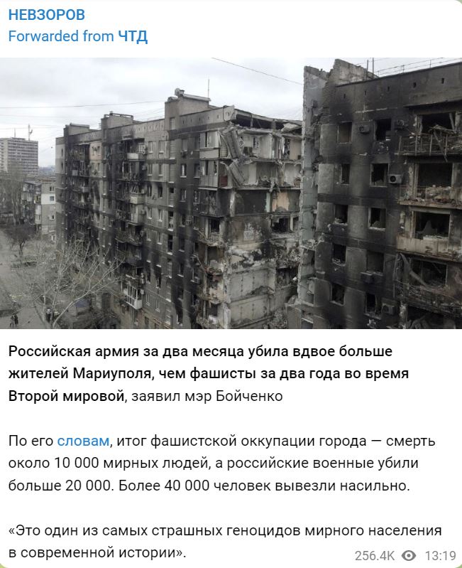 "Ну мир же не слепой. Он внимательно наблюдает за событиями. Он видит, что 80% населения России тащатся от зверств, погромов и массовых убийств, которые путинское воинство устраивает в Украине. Благодаря Путину, у России создался образ страны - садистки. В отношении русских возникает объяснимая брезгливость." НЕВЗОРОВ